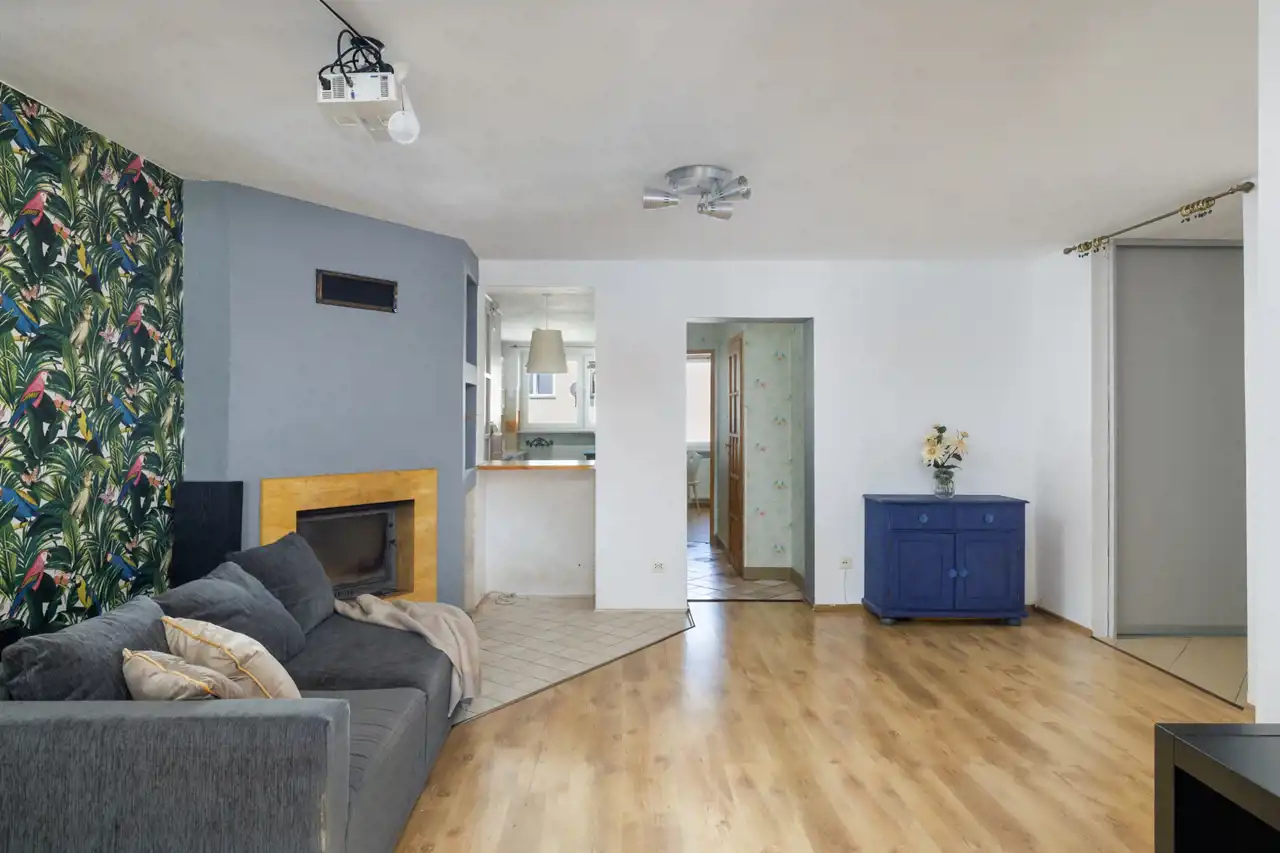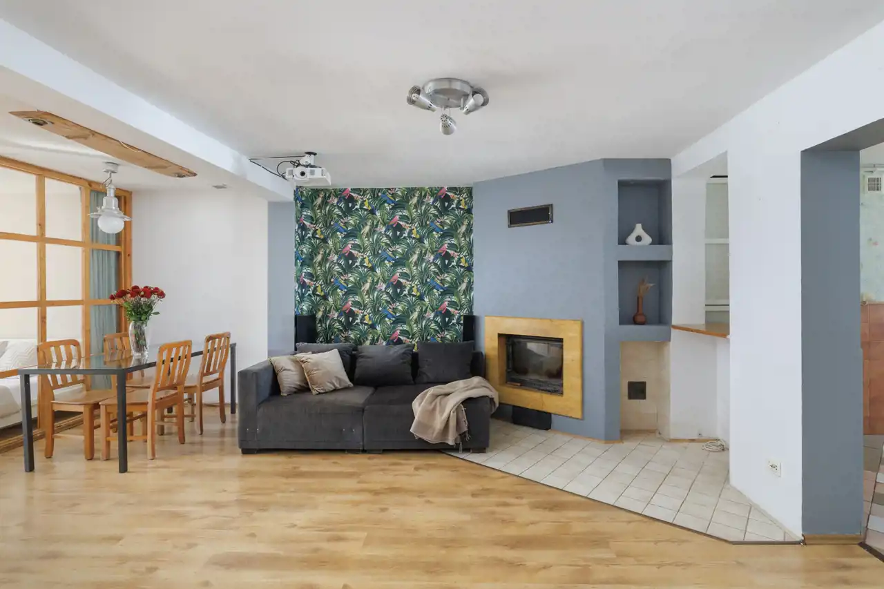 Salon (ok. 24,4 m2) – serce mieszkania, gdzie znajduje się kominek i projektor, które tworzą wyjątkową atmosferę. Dodatkowym atutem jest możliwość wykonania świetlika w dachu, który wprowadzi do salonu naturalne światło dzienne. Takie rozwiązanie nie tylko rozjaśni przestrzeń i podkreśli jej nowoczesny charakter, ale także optycznie powiększy wnętrze.