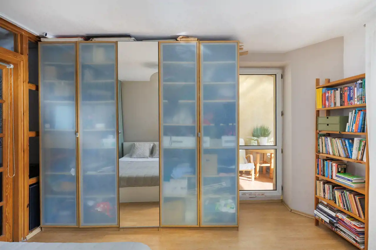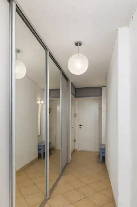 Przedpokój (ok. 8,2 m2) – został zaprojektowany z myślą o maksymalnej funkcjonalności i komforcie. Znajduje się tu duża, pojemna szafa w zabudowie, wykończona lustrzanymi drzwiami, które optycznie powiększają przestrzeń. Dzięki głębokim modułom i przemyślanemu układowi półek, drążków oraz szuflad, szafa zapewnia wygodne miejsce do przechowywania odzieży, obuwia i akcesoriów. Taka organizacja sprawia, że przedpokój pozostaje zawsze schludny i uporządkowany, a jednocześnie staje się praktycznym zapleczem dla całego mieszkania.