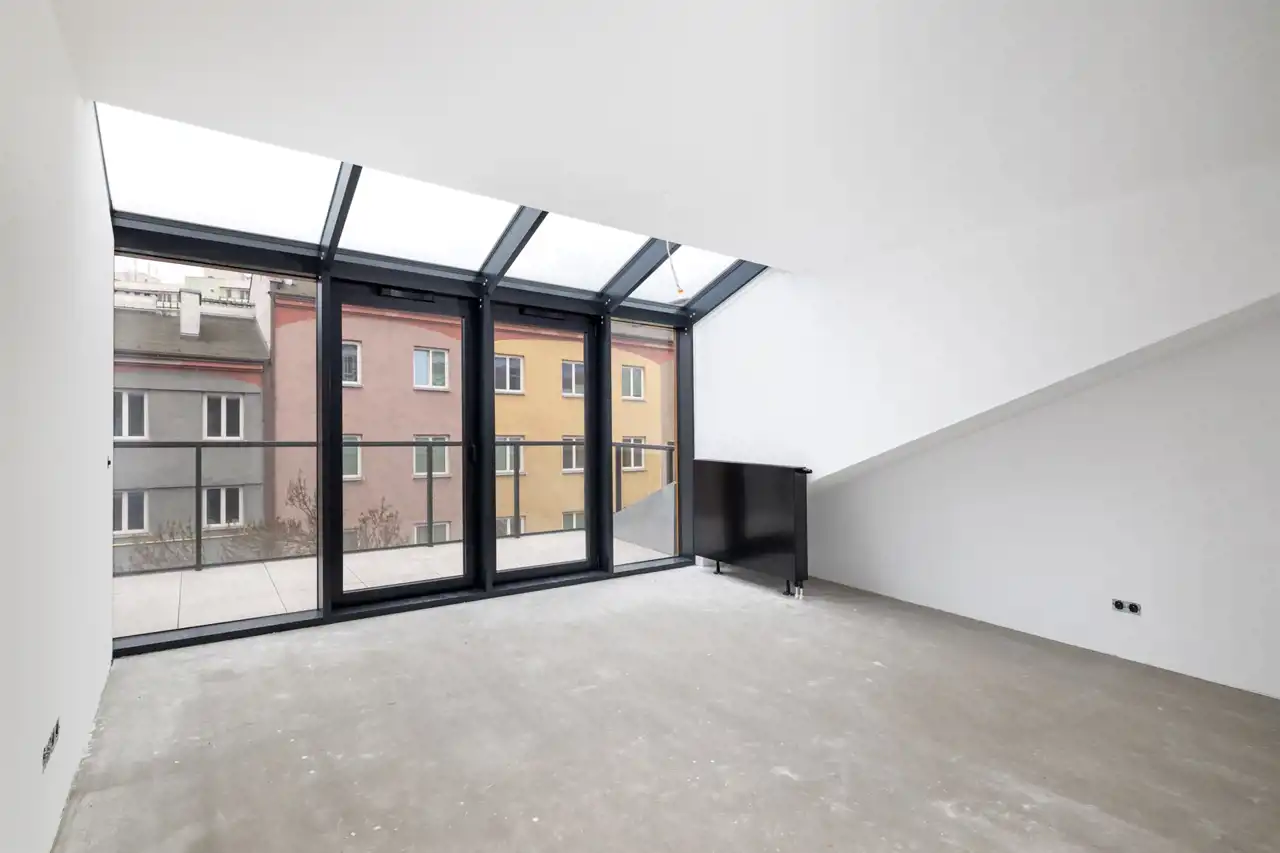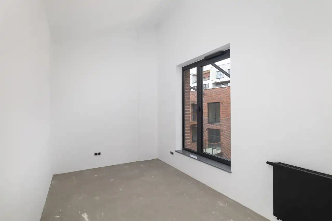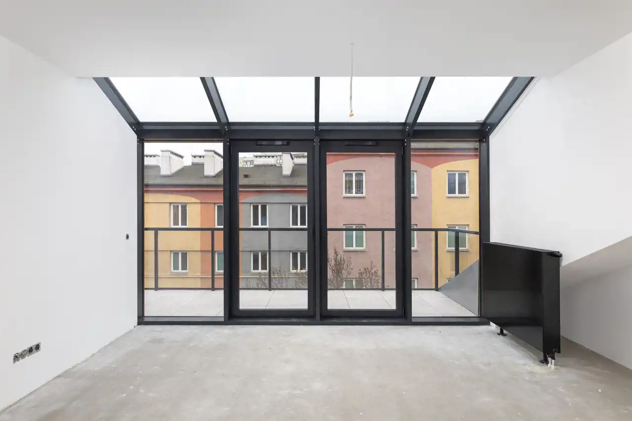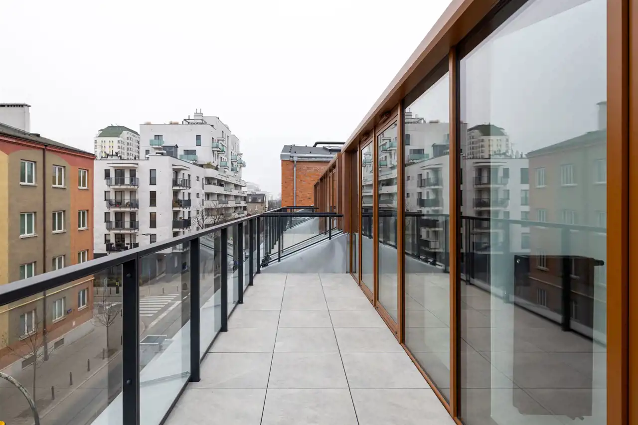 Duże przeszklenia prowadzą na taras, z którego rozpościera się widok na okoliczną zabudowę. W mieszkaniu znajdują się także dodatkowe, mniejsze okna, które doświetlają pozostałe części apartamentu. Mieszkanie posiada korzystną ekspozycję południowo-wschodnią, dzięki czemu jest jasne i słoneczne przez większą część dnia.