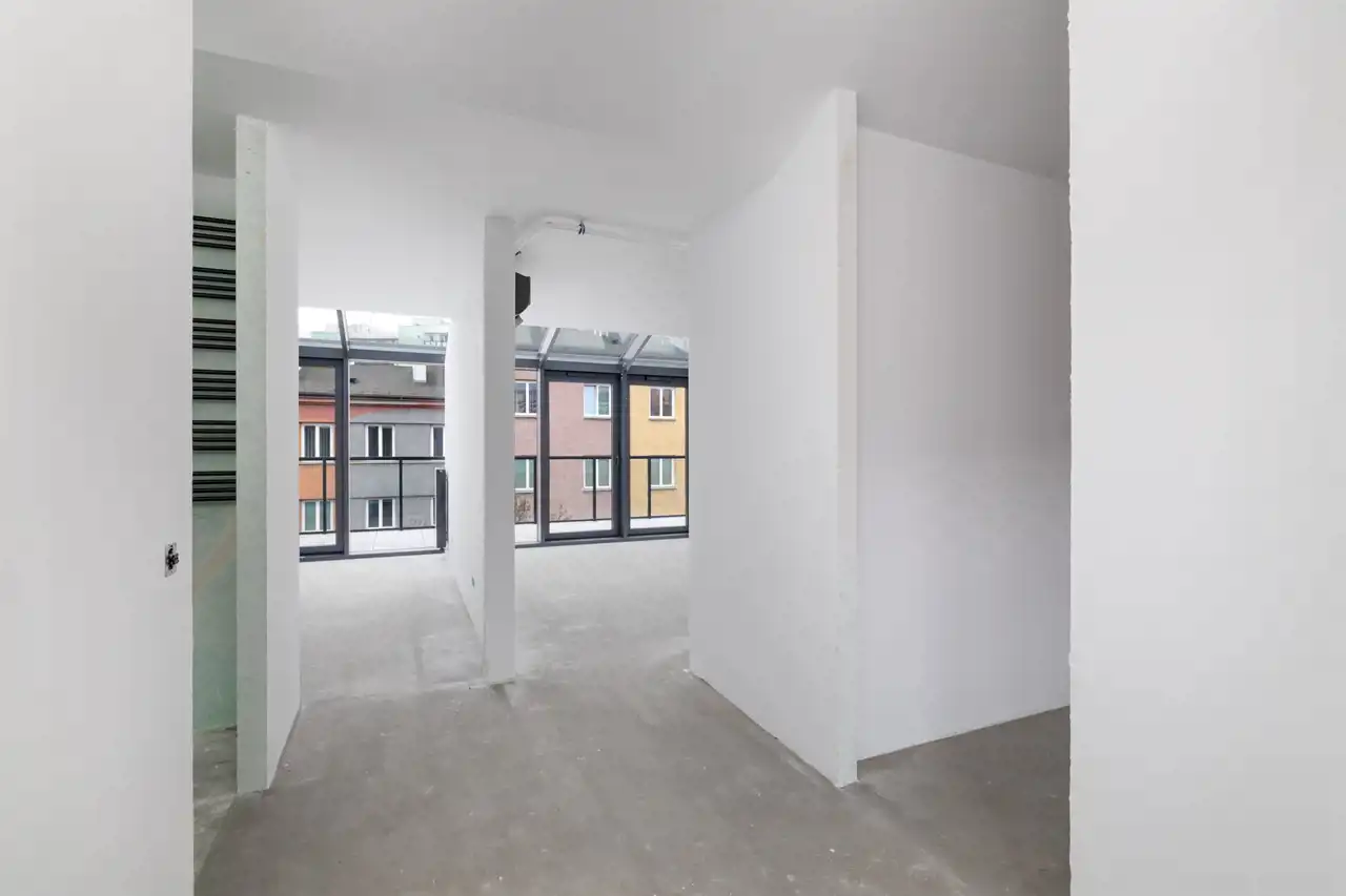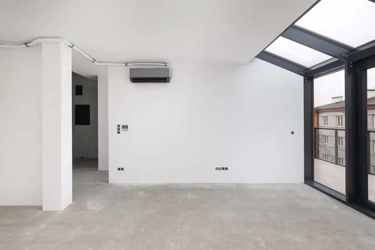 Mieszkanie posiada funkcjonalny układ pomieszczeń z dużą strefą dzienną łączącą salon oraz kuchnię. W lokalu przygotowane są wszystkie przyłącza oraz instalacje pod zabudowę kuchenną i wyposażenie elektryczne. Lokal wyposażony jest w klimatyzację. Wysokość pomieszczeń (3,75 m - 2,64 m) oraz zastosowanie bieli na ścianach potęgują poczucie przestrzeni, dając szerokie możliwości indywidualnej aranżacji.