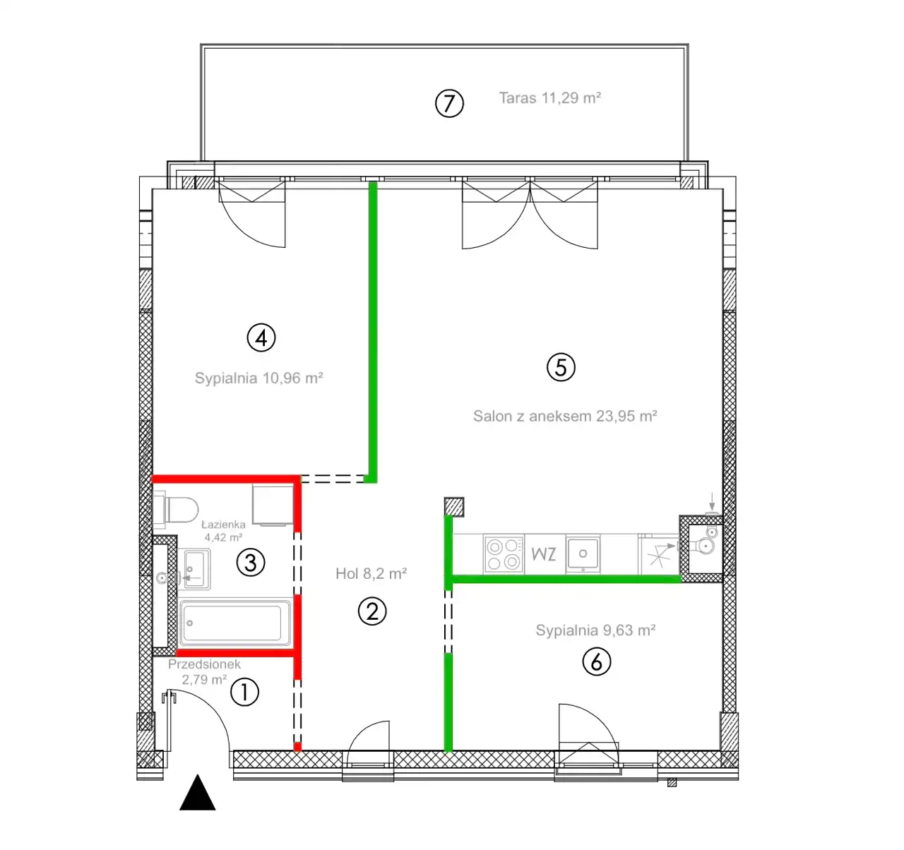 - dwie sypialnie - 10,96 m² ; 9,63 m²