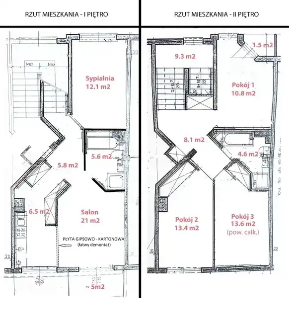 - Kondygnacja górna: 2 pokoje + łazienka + kuchnia w jednym z pokojów (szyb wentylacyjny) + przedpokój na piętrze (8.1 m2 w tym 2 szafy wnękowe) lub półpiętrze (3.4 m2: 1.25m x 2.70m).