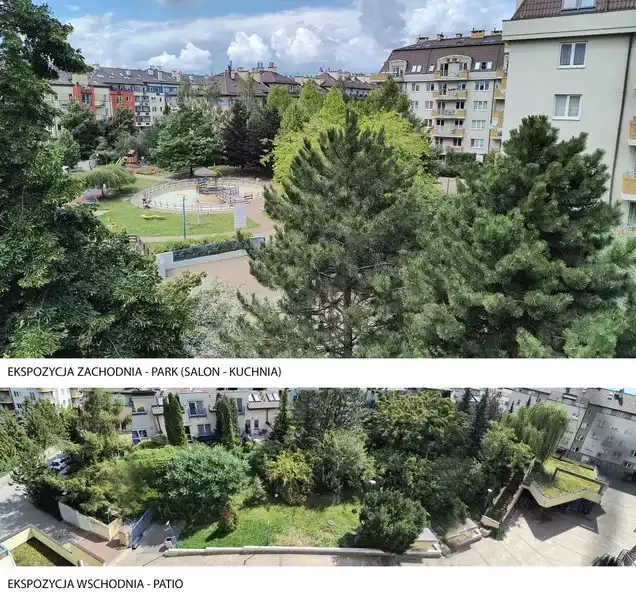 - Część zachodnia: widok z kuchni i salonu na cichy, zielony park z oczkiem wodnym i placem zabaw