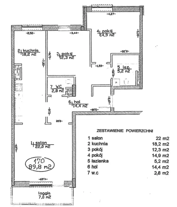 ROZKŁAD: salon (22 m2) w wyjściem na loggię (7 m2), salon połączony z kuchnią (18,20 m2), dwie sypialnie (14,90 m2, 12,30 m2), łazienka (5,20 m2), garderoba/wcześniej WC (2,80 m2), komunikacja (14,40 m2).