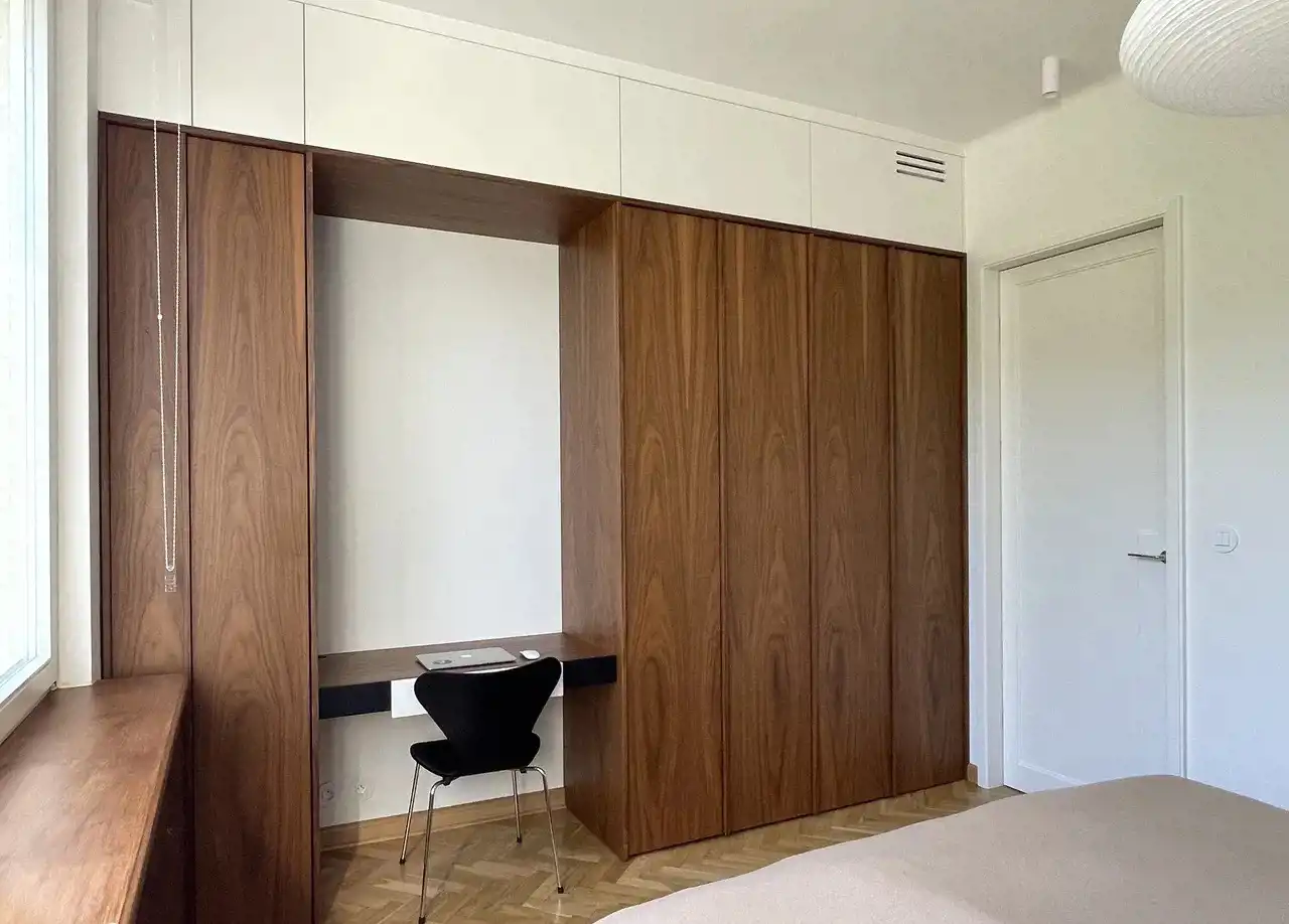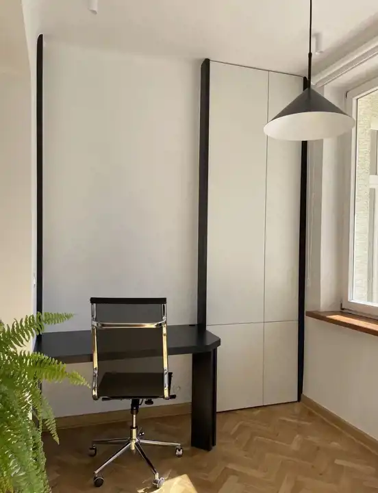 - gabinetu / pokoju gościnnego z biurkiem i szafą w zabudowie i ozdobnymi drzwiami nawiązującymi do oryginalnych (dwuskrzydłowe, łamane)