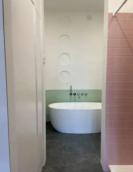 - łazienki z szafami w zabudowie, wolnostojącą wanną, osobnym prysznicem i ogrzewaniem podłogowym