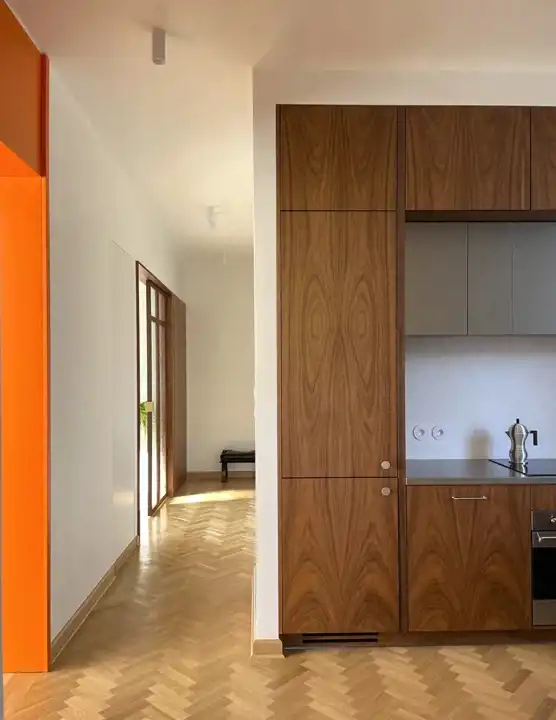 - Dominują orzechowy fornir i stal, a całość dopełniają lakierowane elementy stolarskie w wyrazistych kolorach.