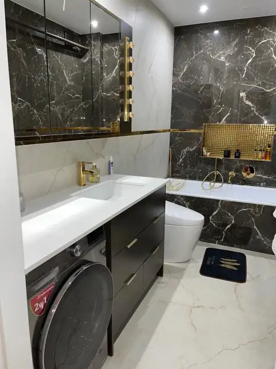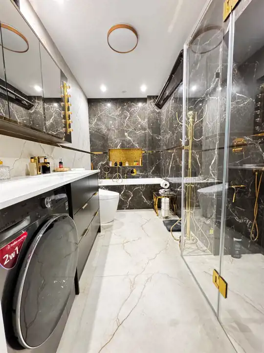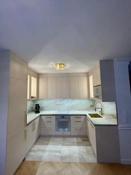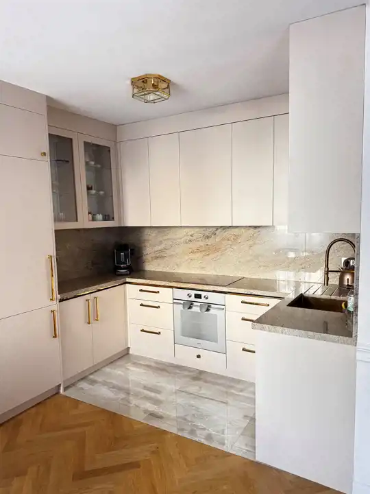 Mieszkanie zostało wykończone w bardzo wysokim standardzie przy użyciu materiałów najwyższej jakości, dębowy parkiet, sztukateria gipsowa, granitowe blaty w kuchni i łazience, glazura w łazience zaprojektowana przez Macieja Zienia, japońska toaleta, sprzęty AGD firmy TEKA.