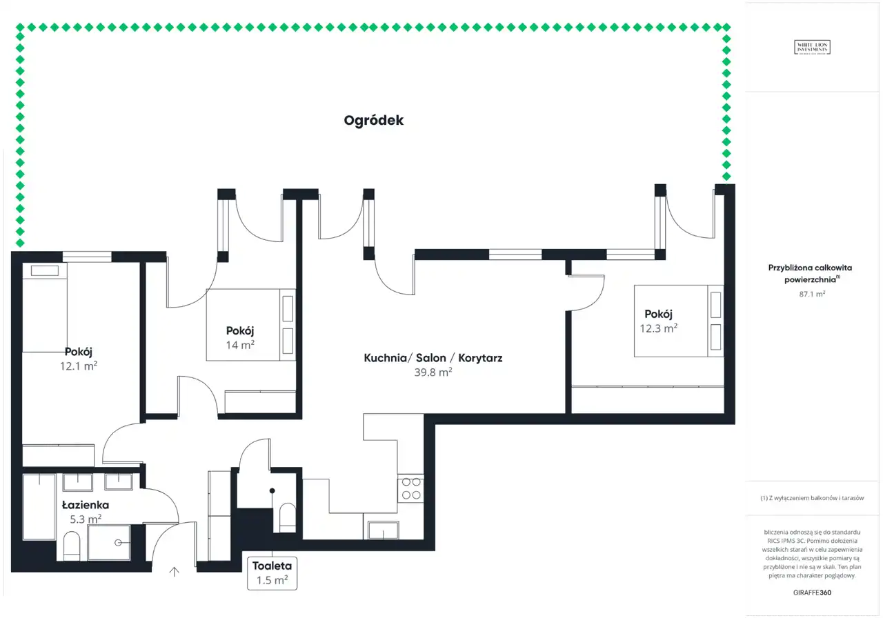 Dodatkową powierzchnię stanowi prywatny ogródek o powierzchni 135,25 m² rozciągający się wzdłuż całej wschodniej elewacji mieszkania. Idealny do stworzenia strefy relaksu, miejsca dla dzieci lub przestrzeni do spotkań.