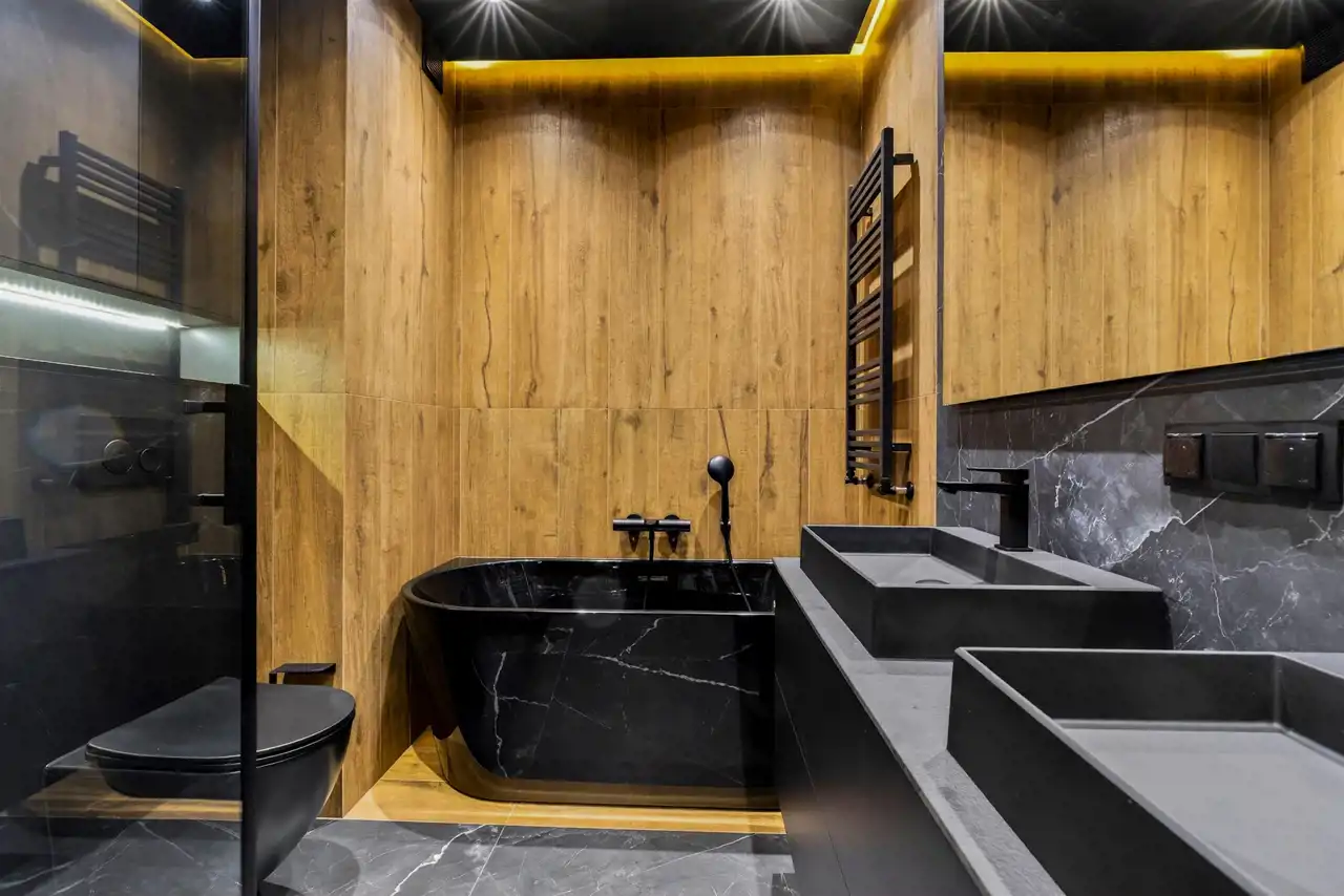 - wolnostojąca czarna wanna o nowoczesnej formie