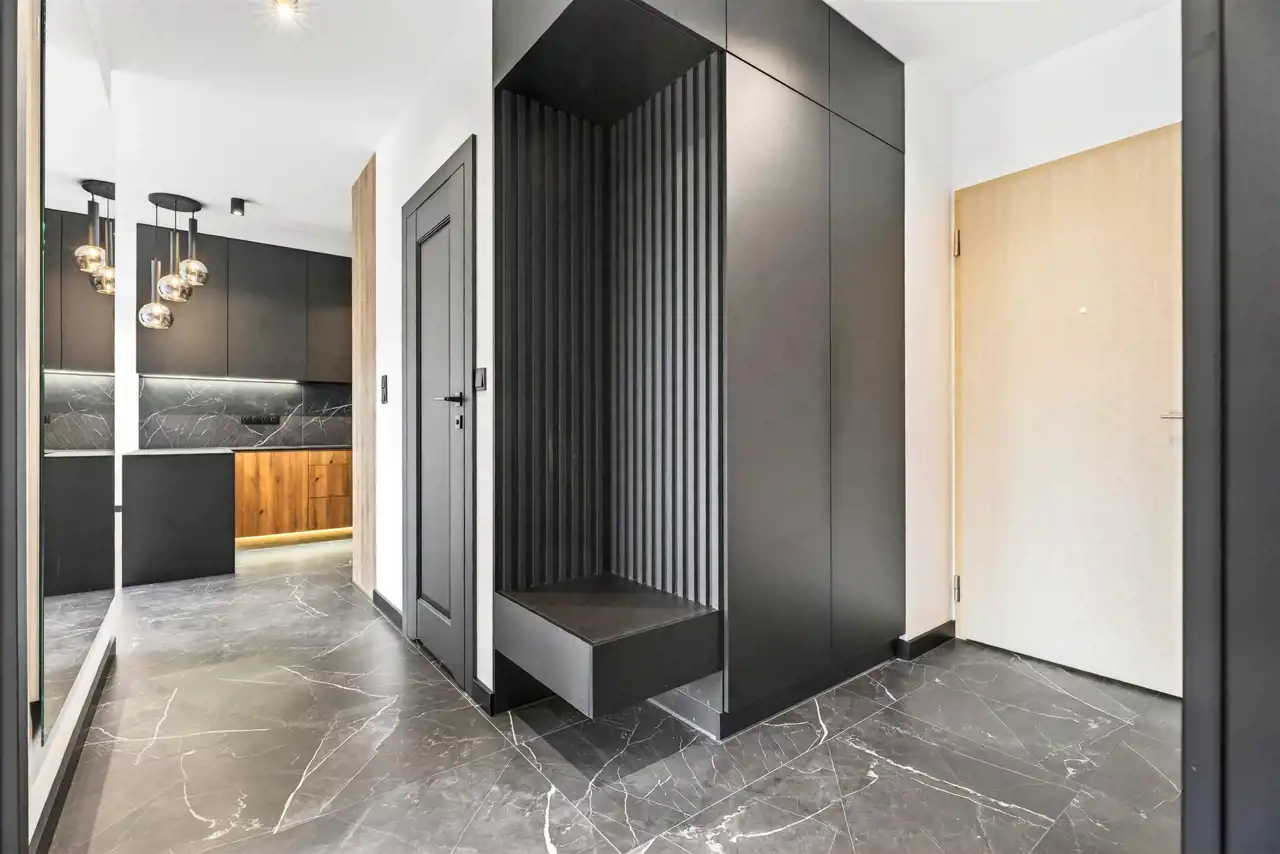 - jasną podłogą kontrastującą z ciemnymi elementami