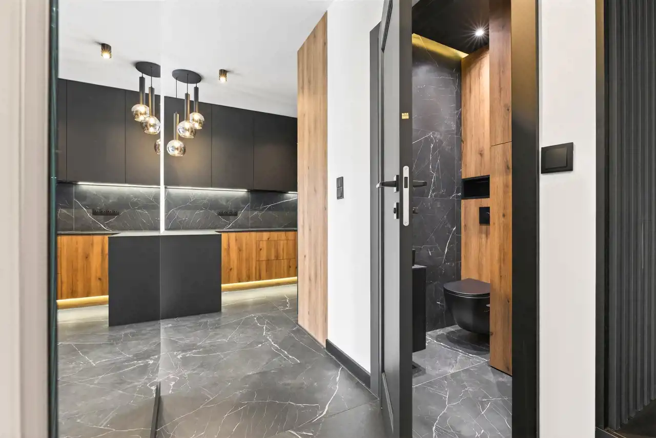 - zabudowa w połączeniu drewna i matowej czerni