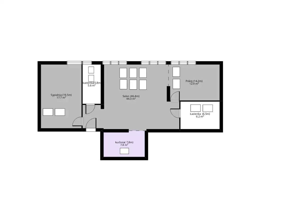 Rozkład ; 3 pokoje, kuchnia 7,8m, dwie łazienki z oknami !!!! - 5,8m i 6,5m. Na planie podane dwie powierzchni; po podłodze i uzytkowa.