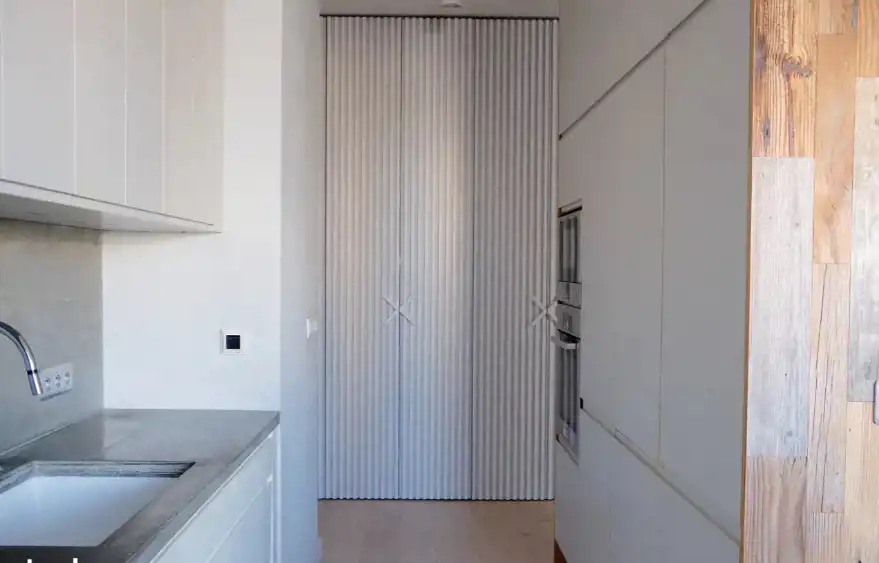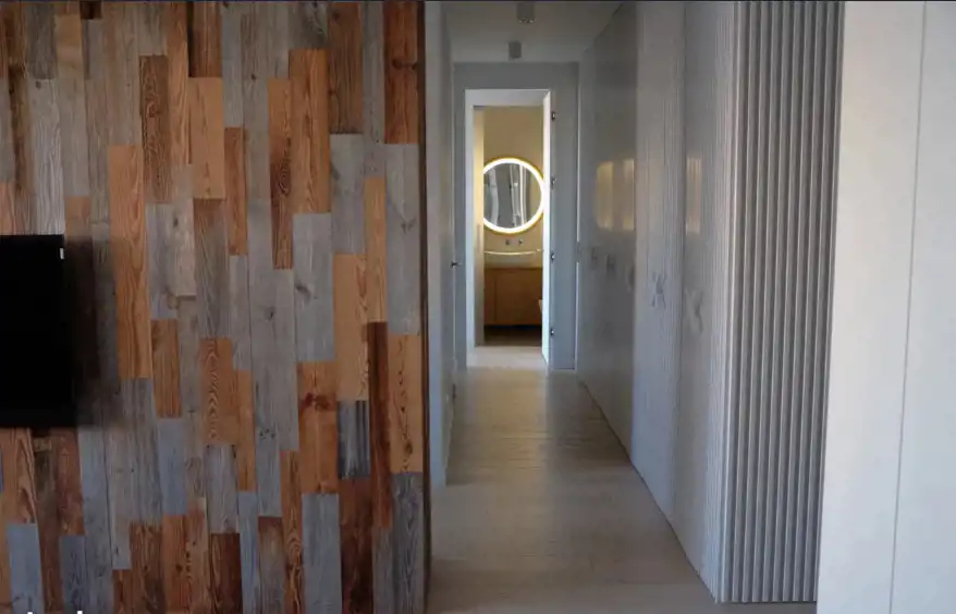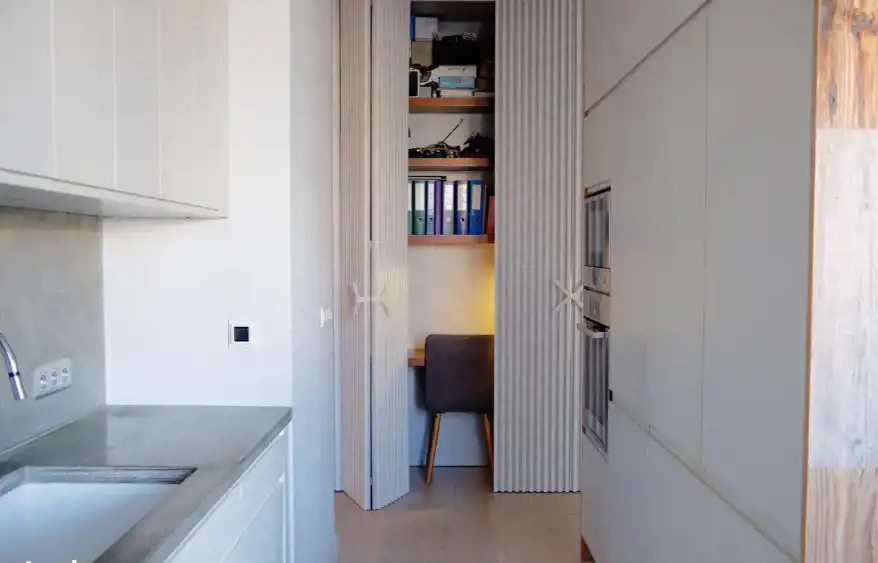Korytarz z przestronnymi szafami do przechowywania rzeczy oraz zamykanym biurkiem do pracy.