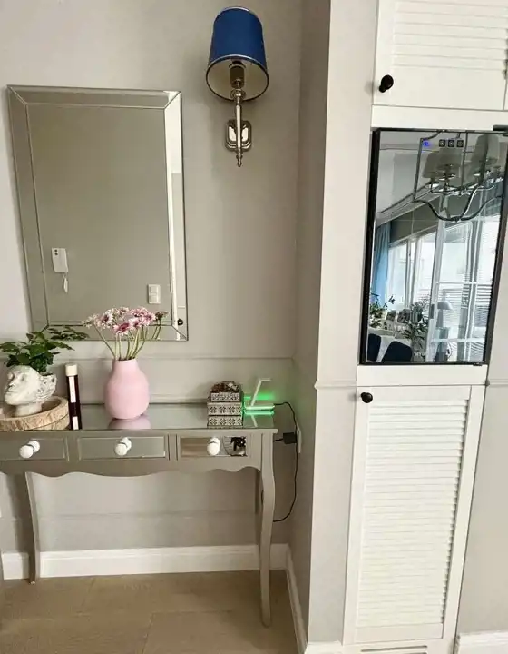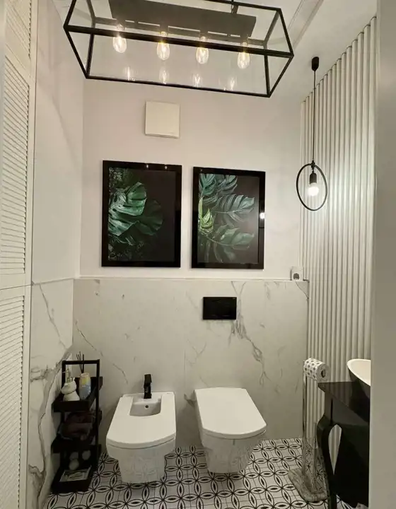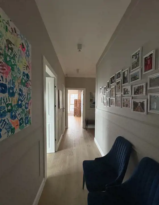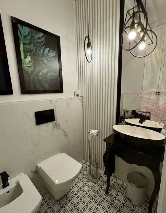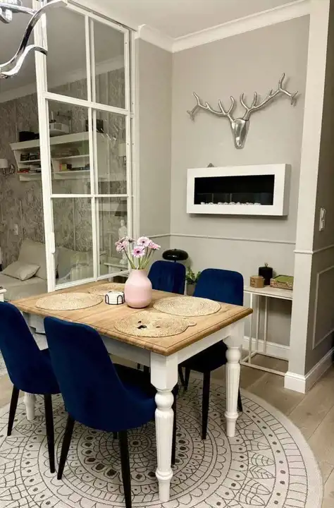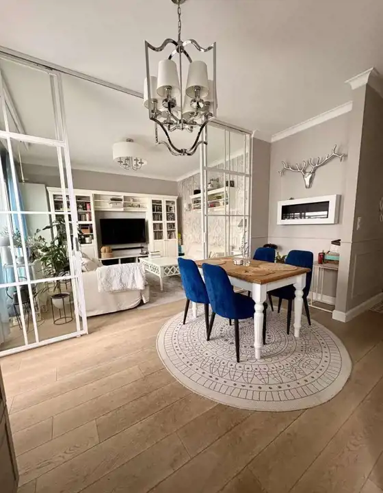 Wnętrze wyróżnia się dębowymi deskami na podłogach oraz elegancką sztukaterią na ścianach, które nadają mu klasy i szyku. Dodatkowo, designerskie fototapety stanowią interesujący akcent, wzbogacając całość aranżacji. Kuchnia została wyposażona w wysokiej klasy sprzęt, w tym lodówkę z funkcją kostkarki oraz winiarkę, co z pewnością docenią miłośnicy kulinarnych doznań.