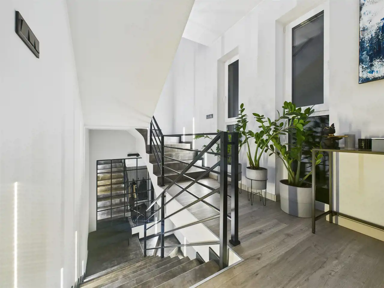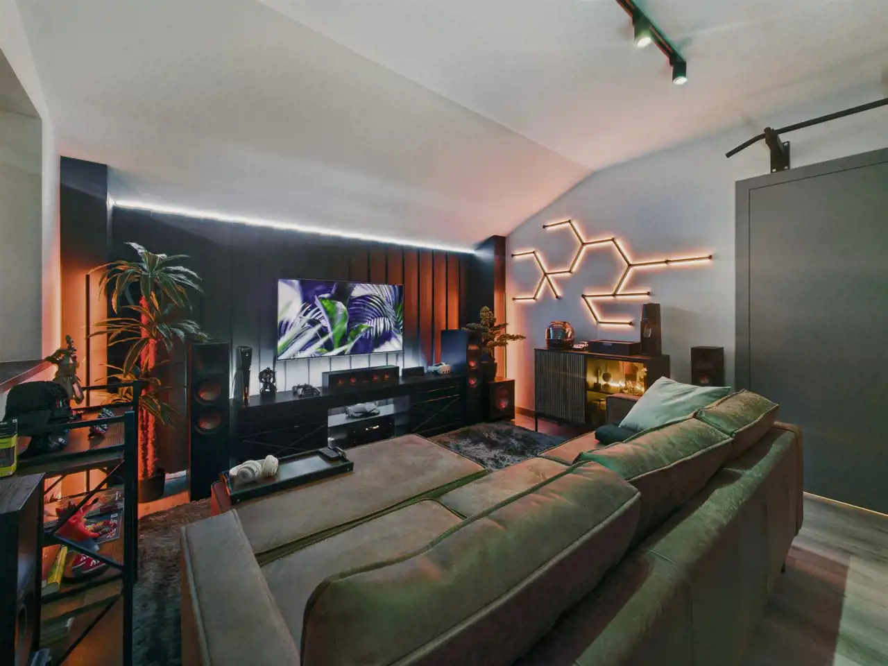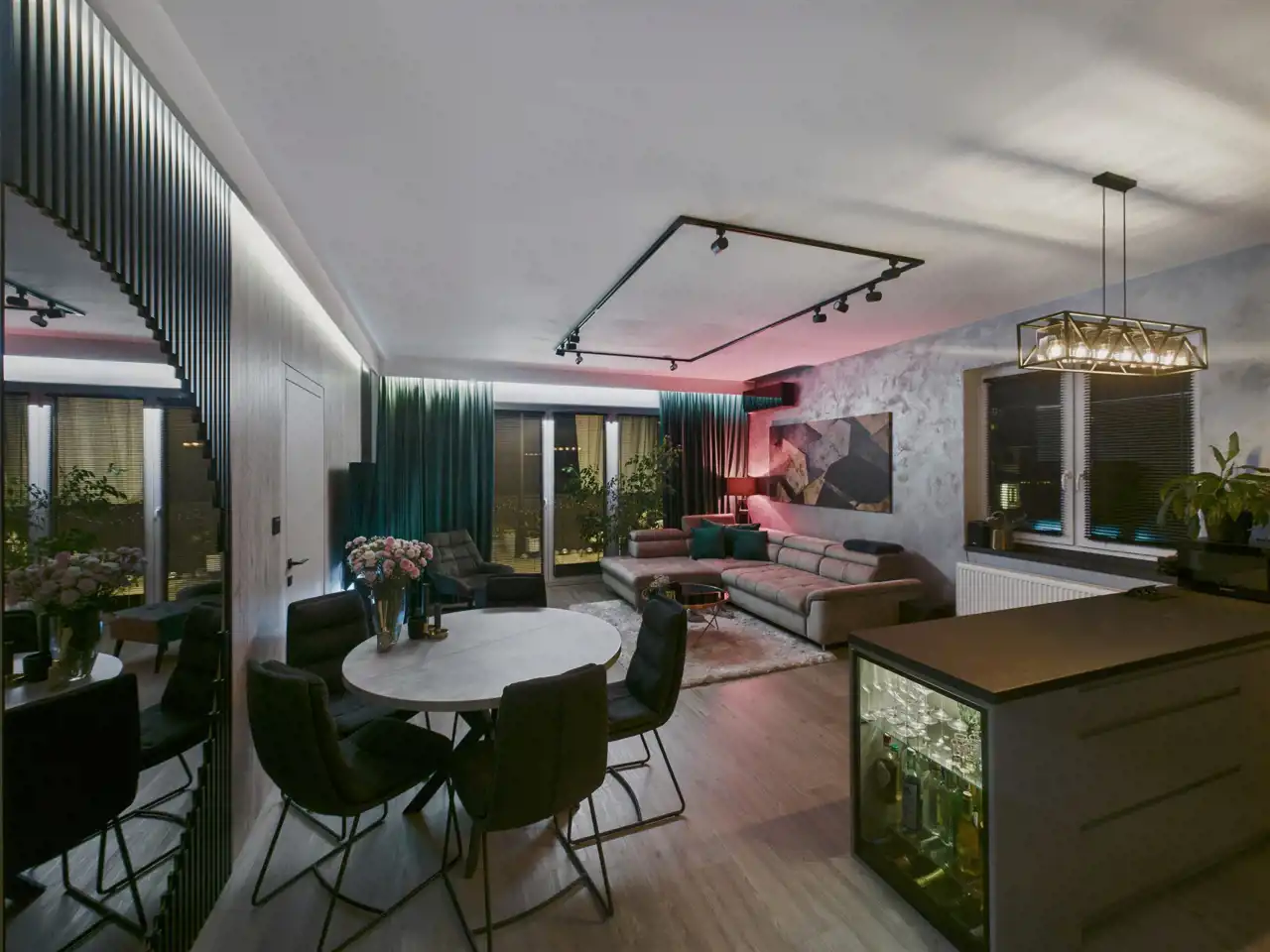 Apartament szczególnie efektownie prezentuje się wieczorami – dzięki systemowi Philips Hue ze scenami świetlnymi i nastrojowym podświetleniem schodów.