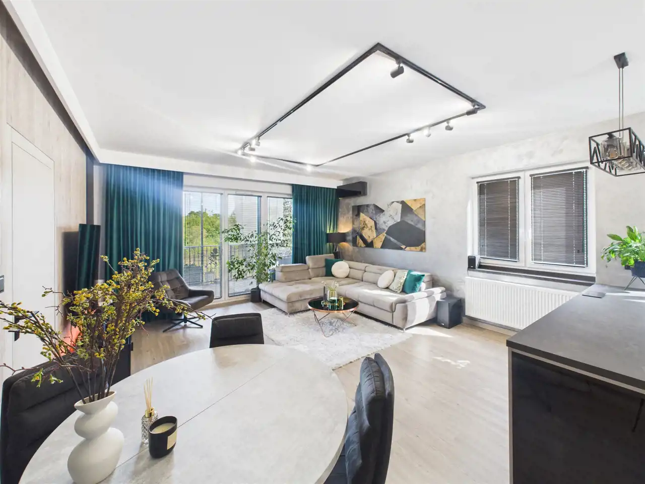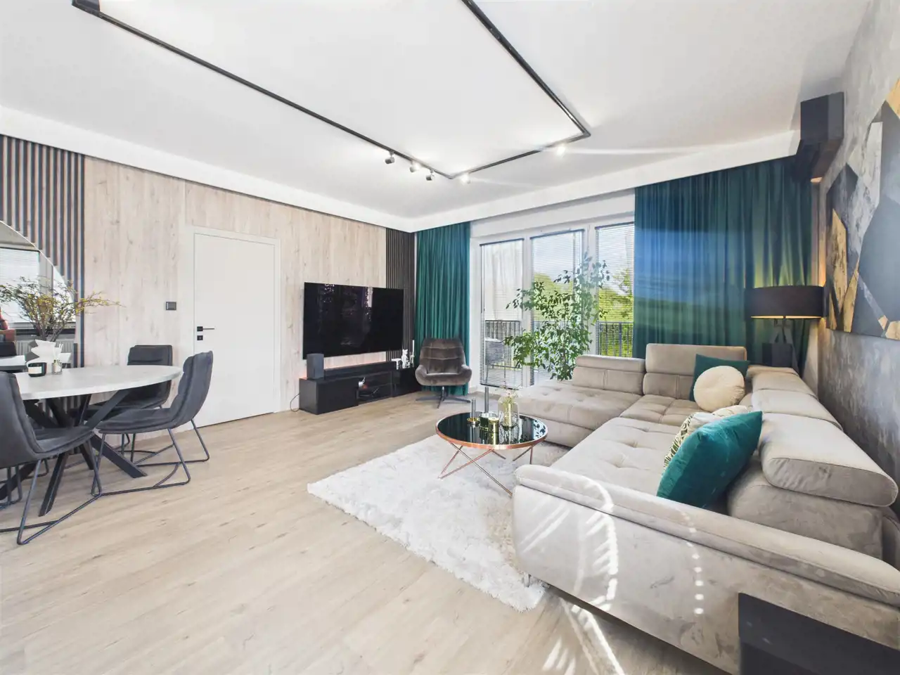 • salon z aneksem kuchennym (45,5 m²) z wyjściem na balkon (9 m²),