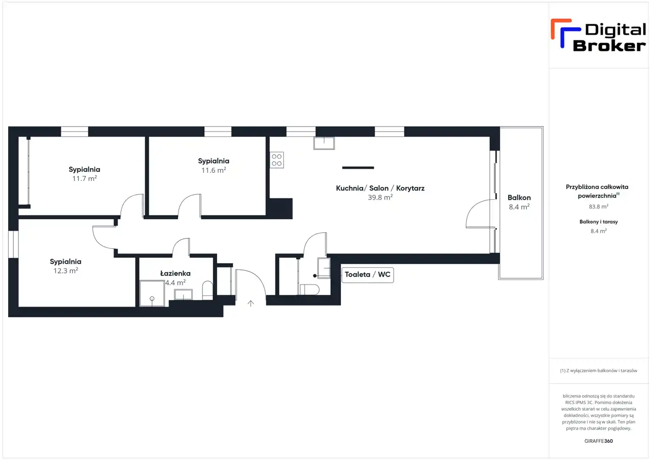 - 4 pokoje: przestronny salon z aneksem kuchennym, sypialnia master, dwa dodatkowe pokoje, łazienka + toaleta