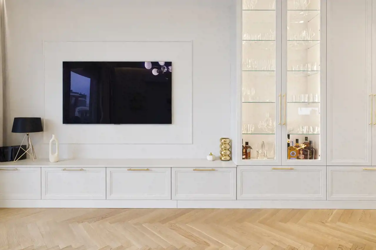 - Stolarka meblowa na wymiar, wysokiej klasy sprzęt AGD, lita deska dębowa na podłogach.