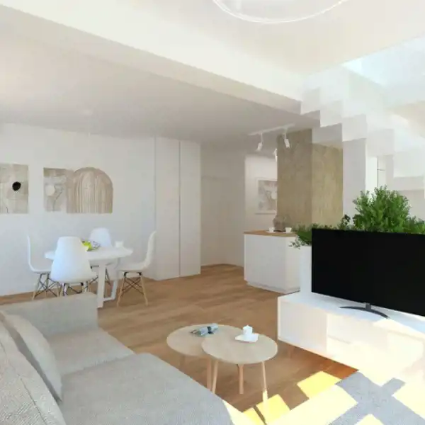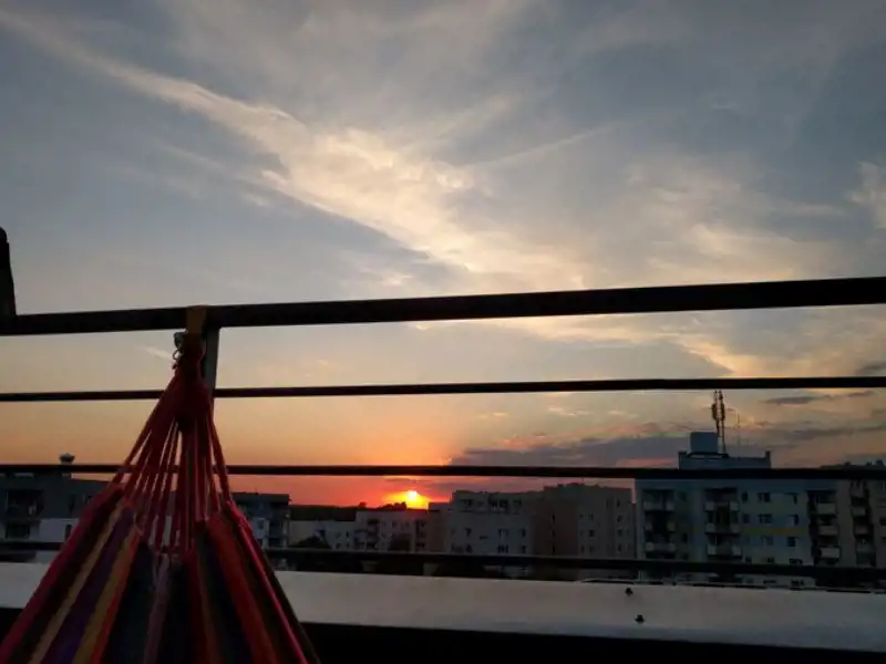 Mieszkanie; dwupoziomowe na ostatnim piętrze (bez skosów, pełna wysokość pomieszczeń na obu poziomach) z przestronnym 20 m tarasem. Wspaniale doświetlone pokoje, z dwóch stron świata (położenie południowo - zachodnie), z dużymi oknami.
