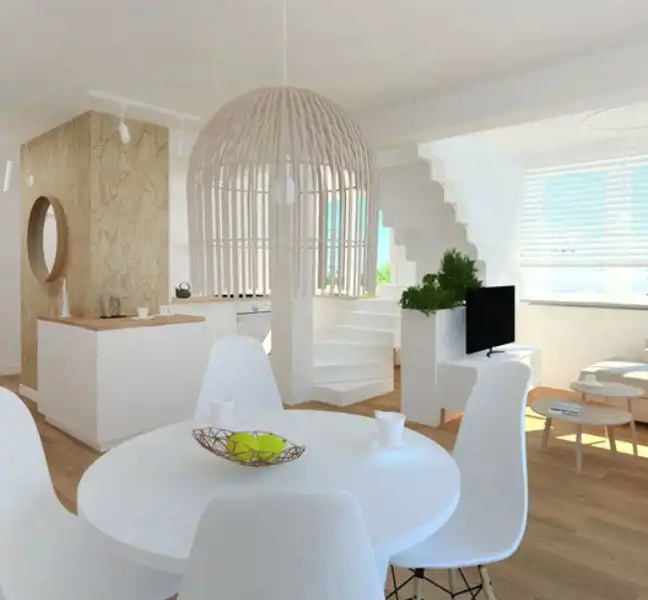 Przemyślany układ pomieszczeń pozwala na elastyczne kształtowanie przestrzeni np. osłonięcie kuchni od salonu lub podzielenie największego pokoju na piętrze na dwa mniejsze (4 lub 5 pokoi). Ulokowanie przestrzeni na dwóch poziomach dzieli mieszkanie na strefę dzienną i strefę nocną.