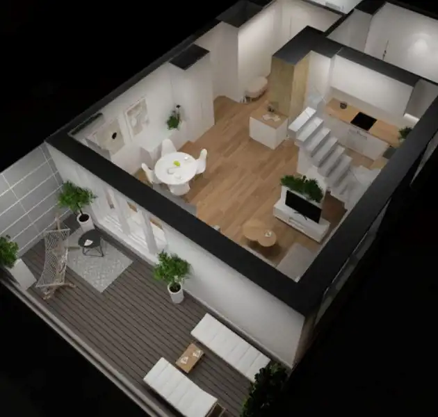 Przestrzeń starannie wykończona materiałami wysokiej jakości - klatka schodowa (indywidualny projekt) stalowa, lakierowana proszkowo z poręczami ze szkła hartowanego, klejonego (bezpiecznego), podłoga dębowa (długie, szerokie deski w całym mieszkaniu), klimatyzacja na obu poziomach, kompozytowe wykończenie tarasu.