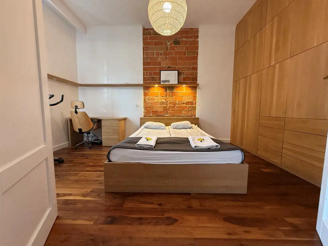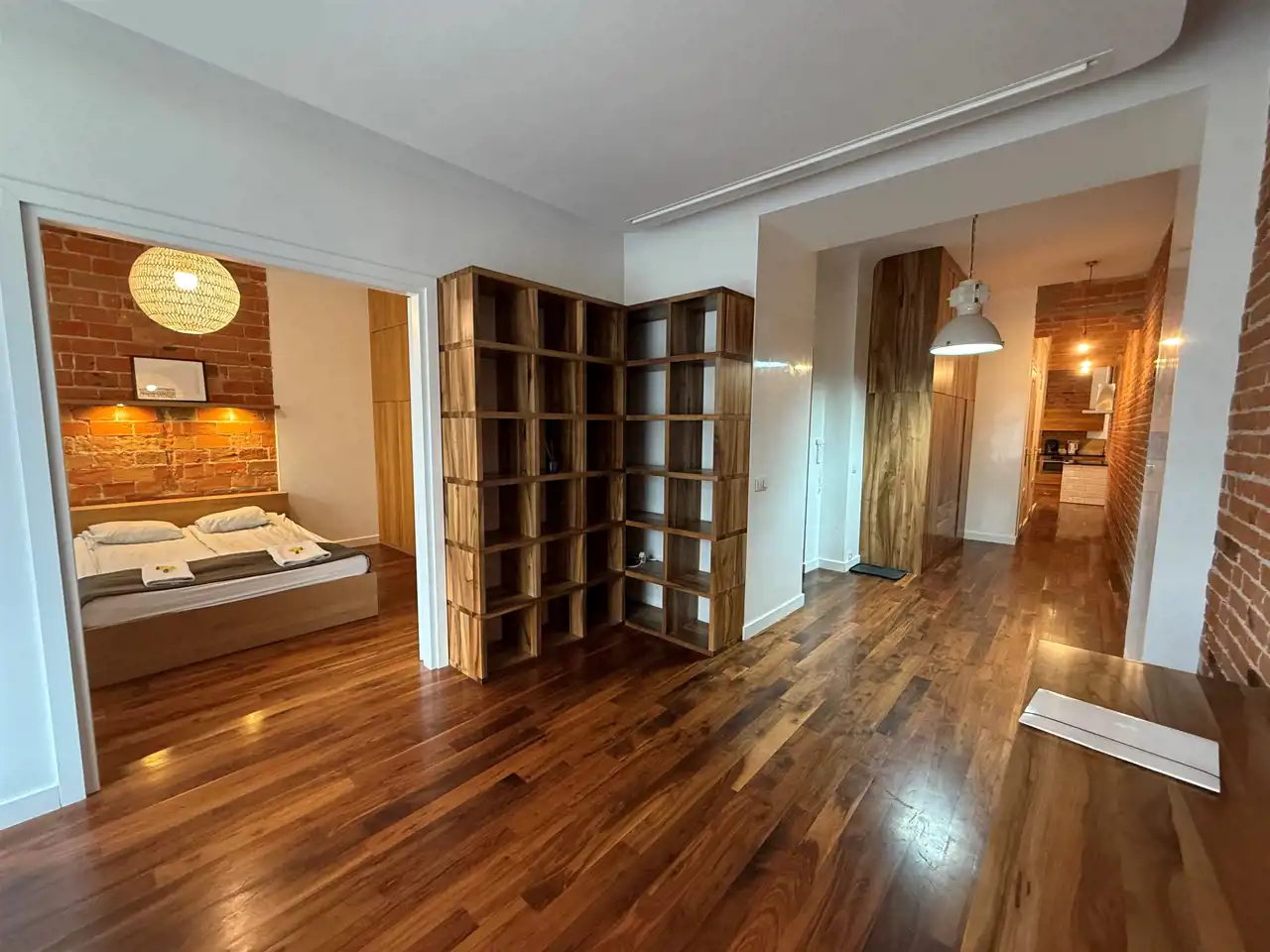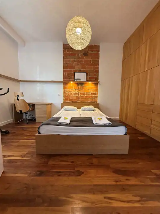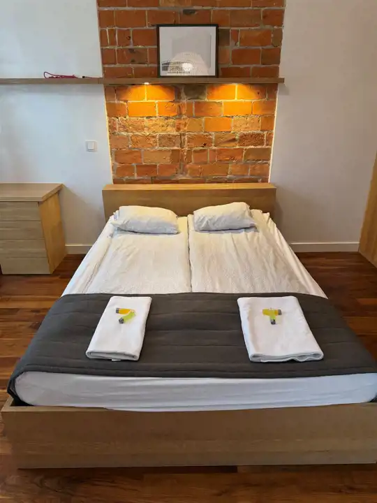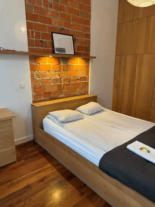 Apartament, o powierzchni użytkowej 72 m2, składa się z sypialni, salonu, kuchni ( osobnej) i łazienki z kabiną prysznicową.