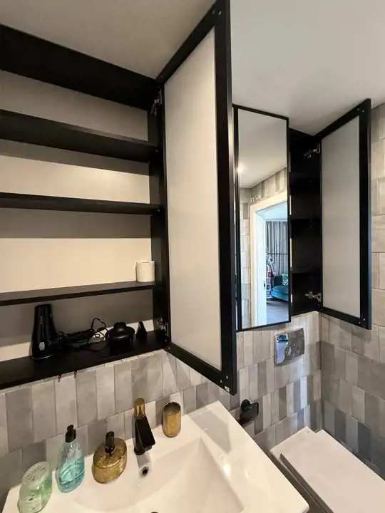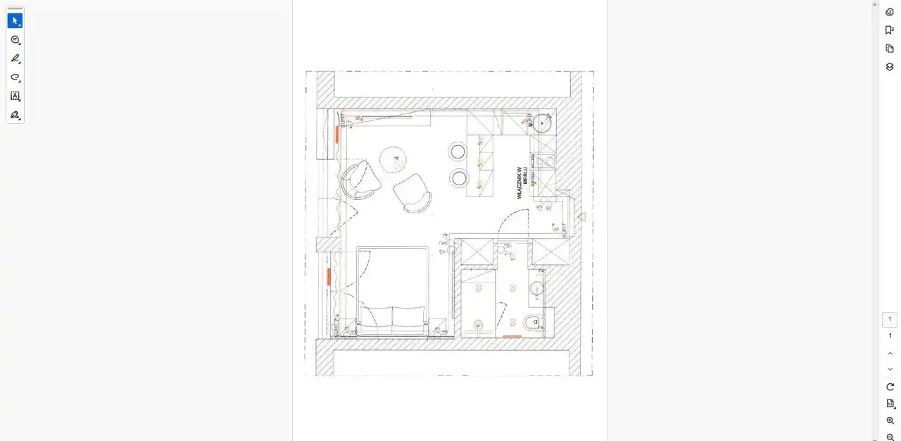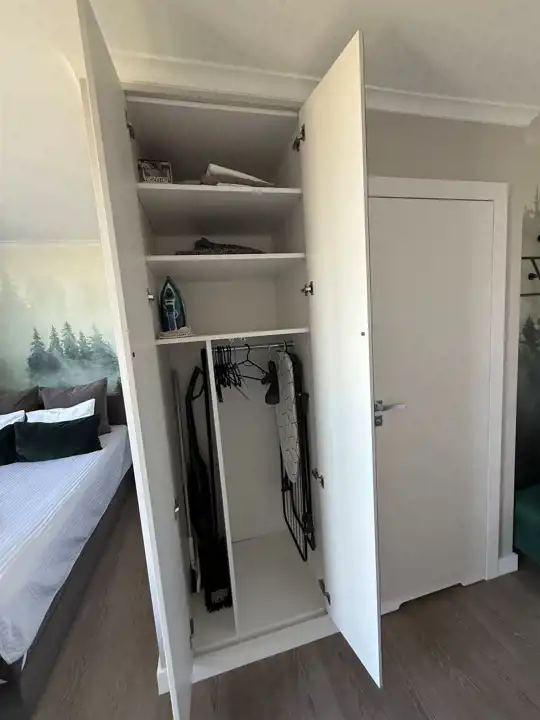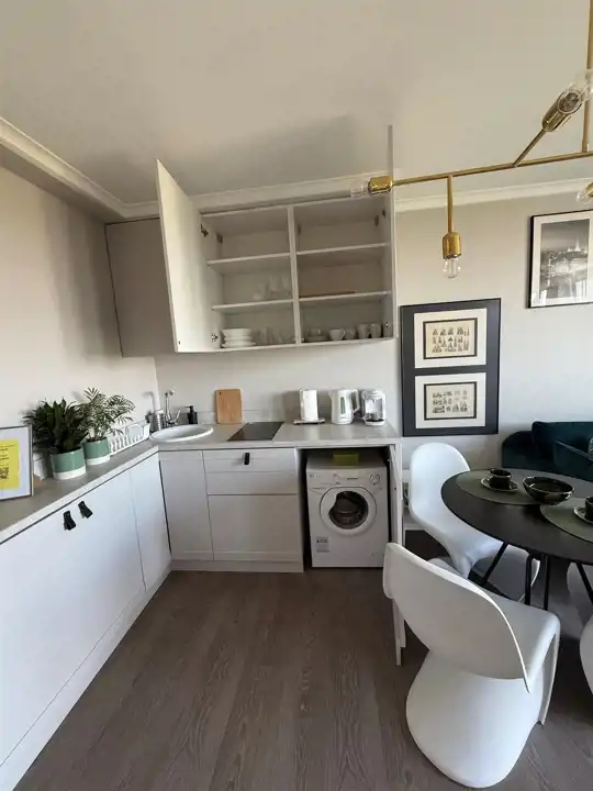 Układ: salon z aneksem kuchennym, wydzielona strefa sypialniana, łazienka z prysznicem, szafy w zabudowie
