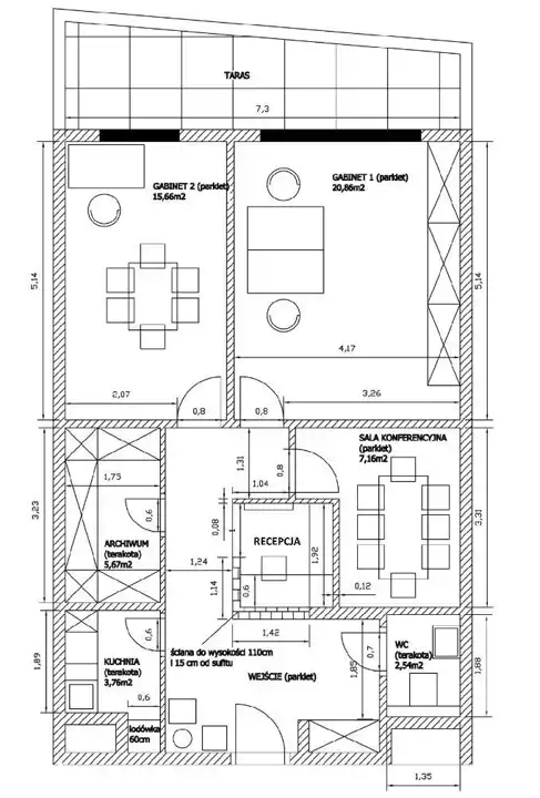 Składa się z 2 gabinetów (z jednego jest wyjście na taras o pow. 7,5 m2), sali konferencyjnej lub dodatkowego gabinetu, recepcji z poczekalnią, pomieszczenia gospodarczego (archiwum), oddzielnego aneksu kuchennego i toalety.