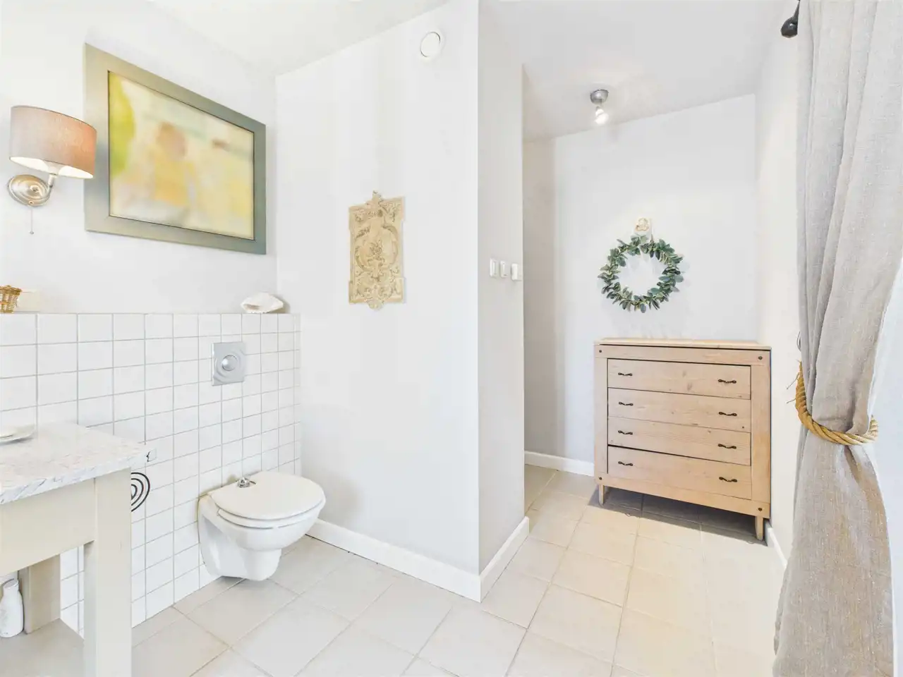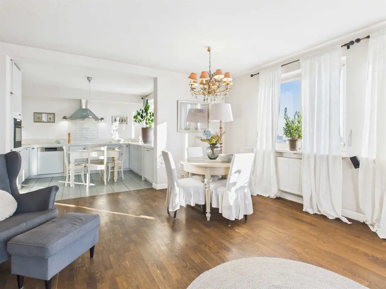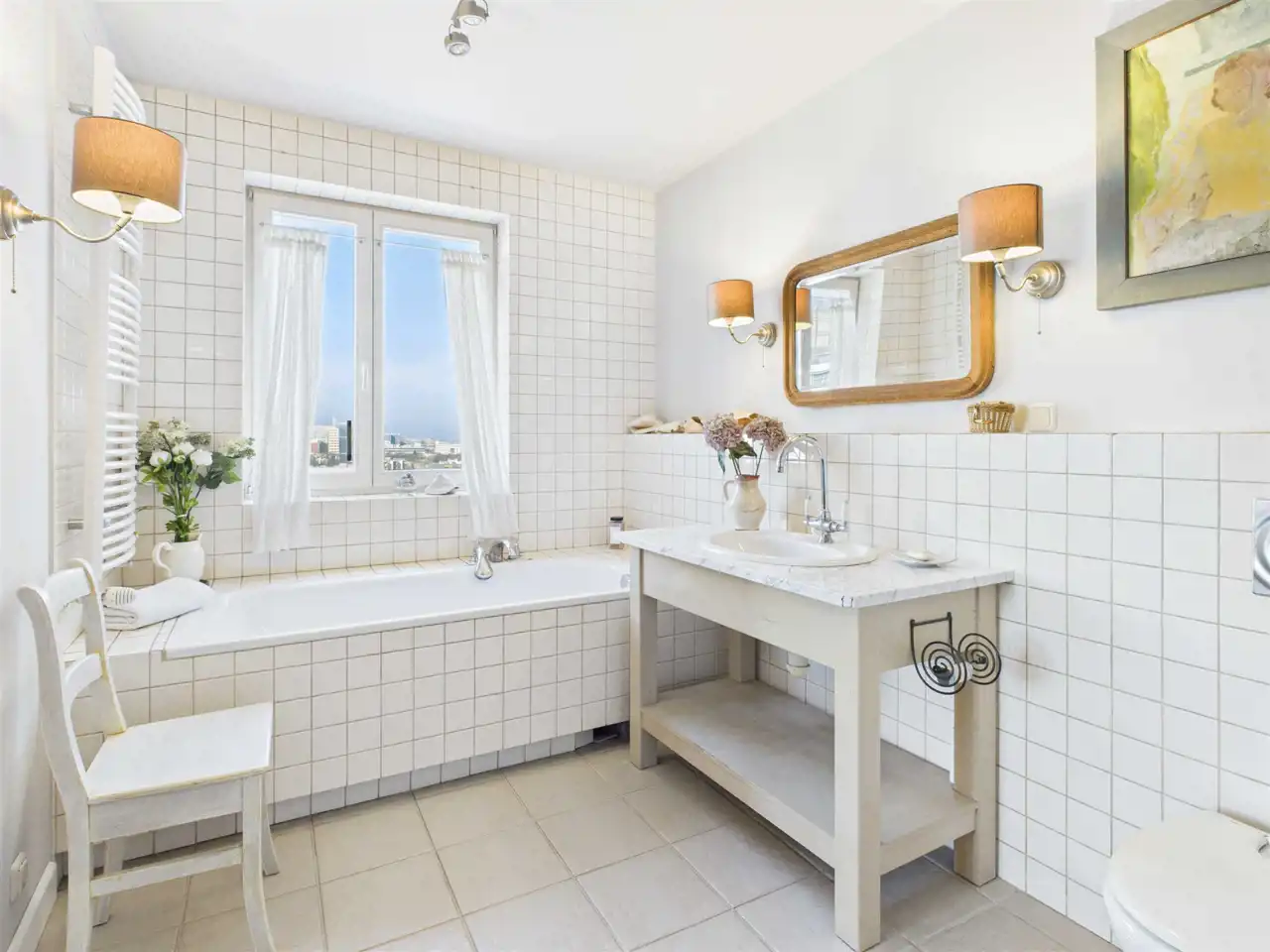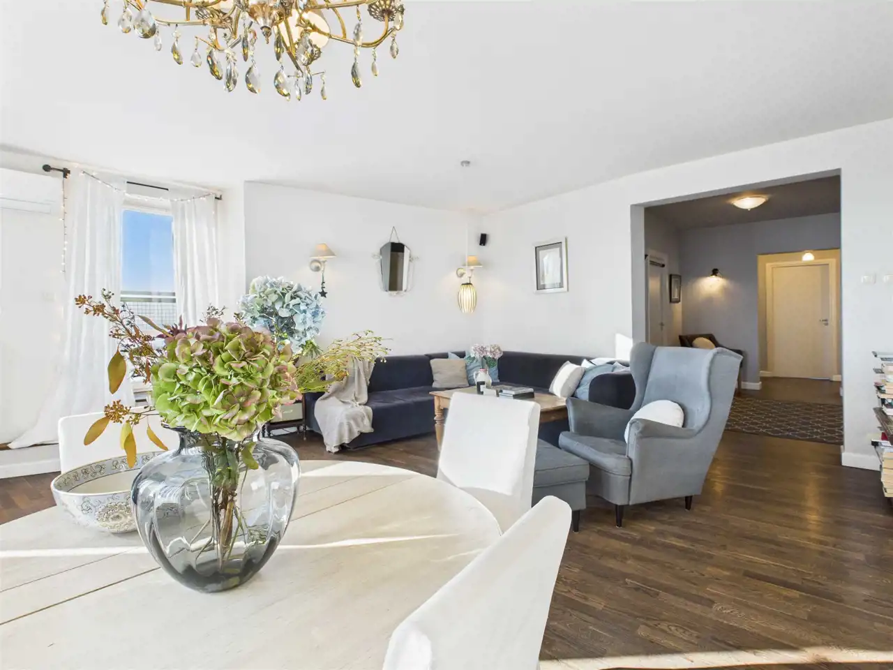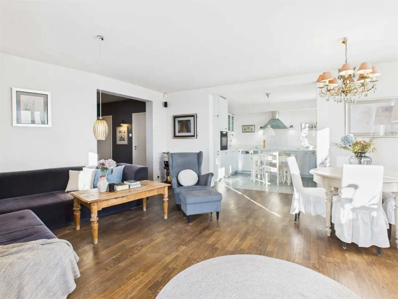 Wnętrze zostało zaprojektowane przez architekta i urządzone w dominującym stylu shabby chic, który łączy elegancję z przytulnością, tworząc ciepłą, harmonijną przestrzeń sprzyjającą codziennemu wypoczynkowi.