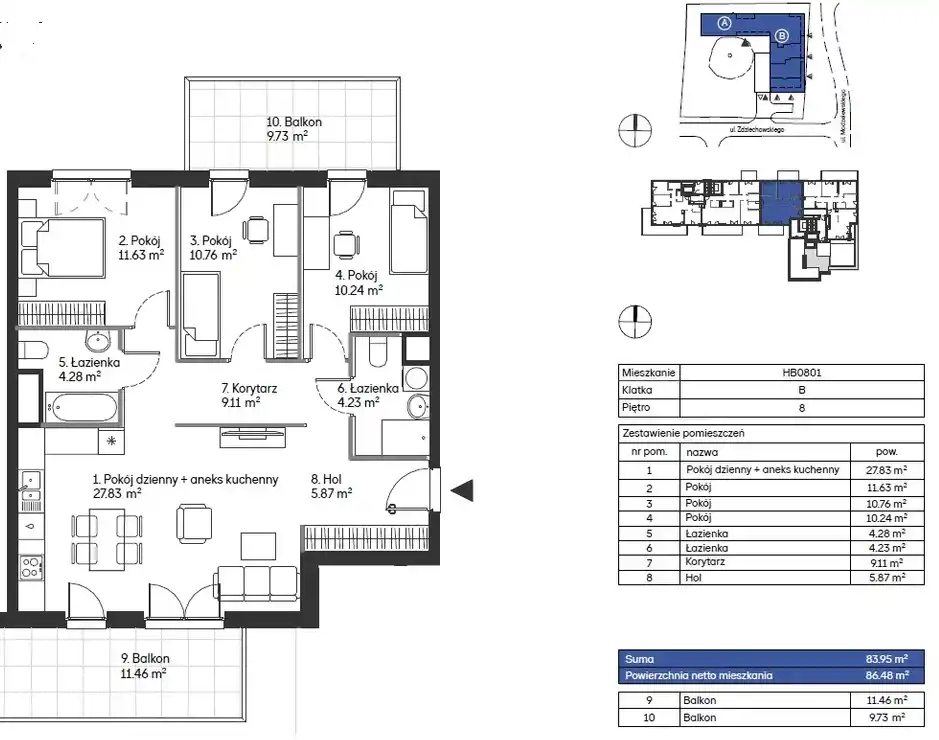 Duże, przestronne mieszkanie o powierzchni 84 m2, 4-pokojwe, położone na 8. piętrze w 8-piętrowym w apartamentowcu z 2025 r., z widokiem na miasto, zlokalizowane na Mokotowie przy ul. Zdziechowskiego/ Domaniewska.
