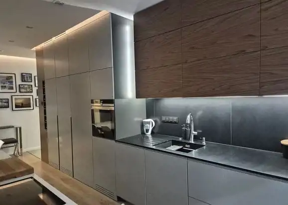 Wnętrze wykończone w wysokim standardzie z użyciem materiałów bardzo dobrej jakości: meble na wymiar, pełne wyposażenie AGD Siemens.