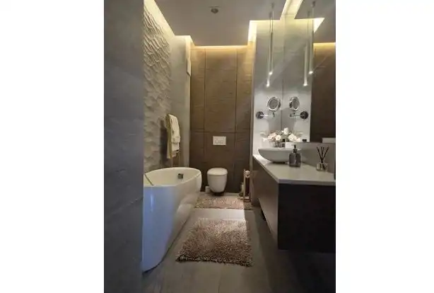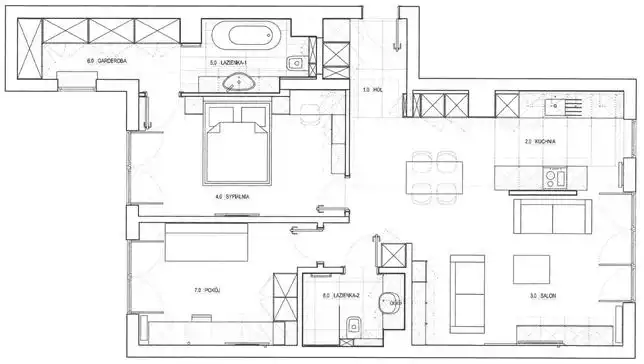 - przestronnego salonu z kuchnią i jadalnią (40 m²) z wyjściem na loggię- sypialni (15 m²) z prywatną garderobą (6,5 m²) i łazienką z wanną (5,5 m²),