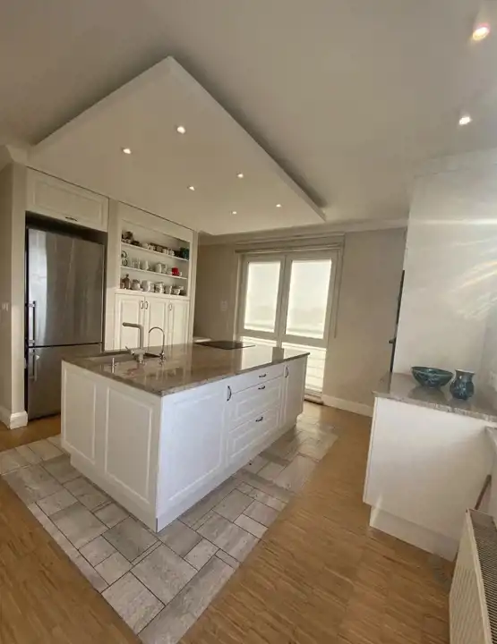 W kuchni zabudowa na wymiar: szafy i szafki z ok. 20 szufladami i dobrej klasy sprzęt AGD (lodówka, zmywarka, płyta grzejna, piekarnik, mikrofalówka).