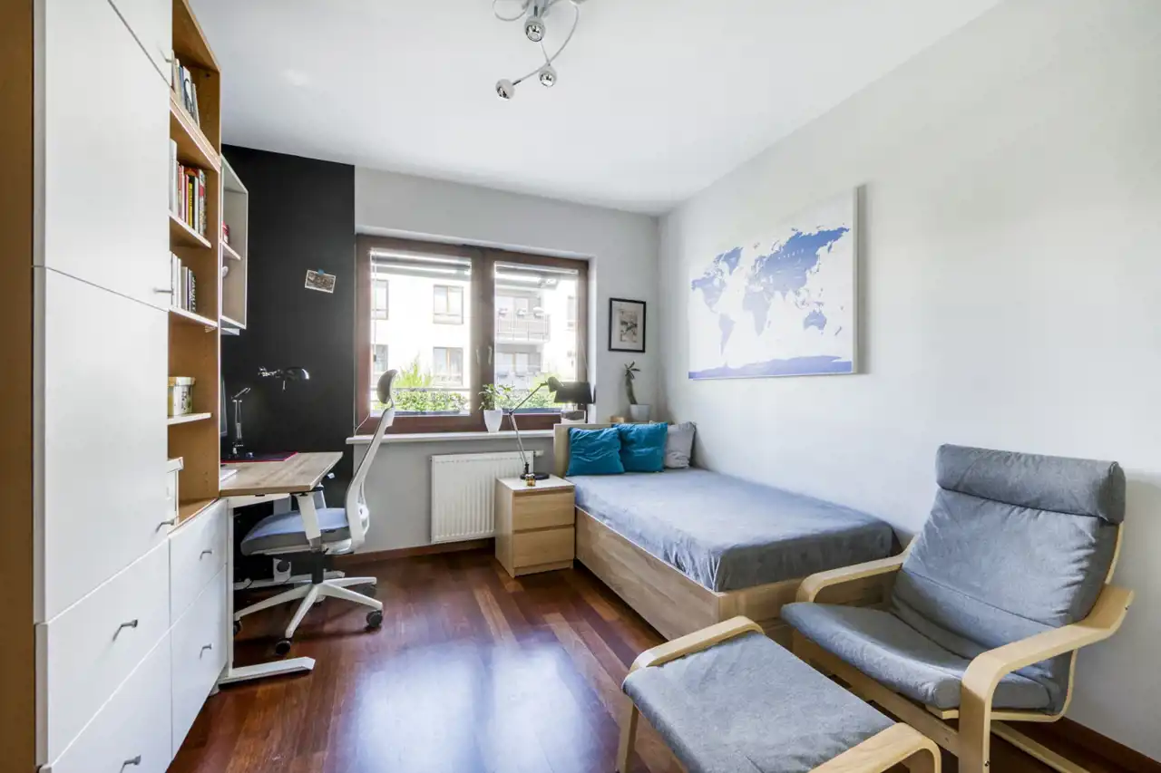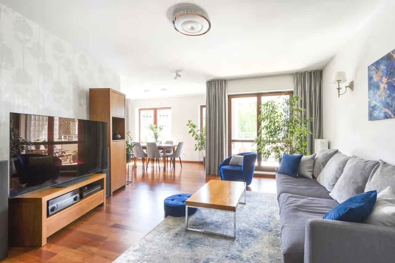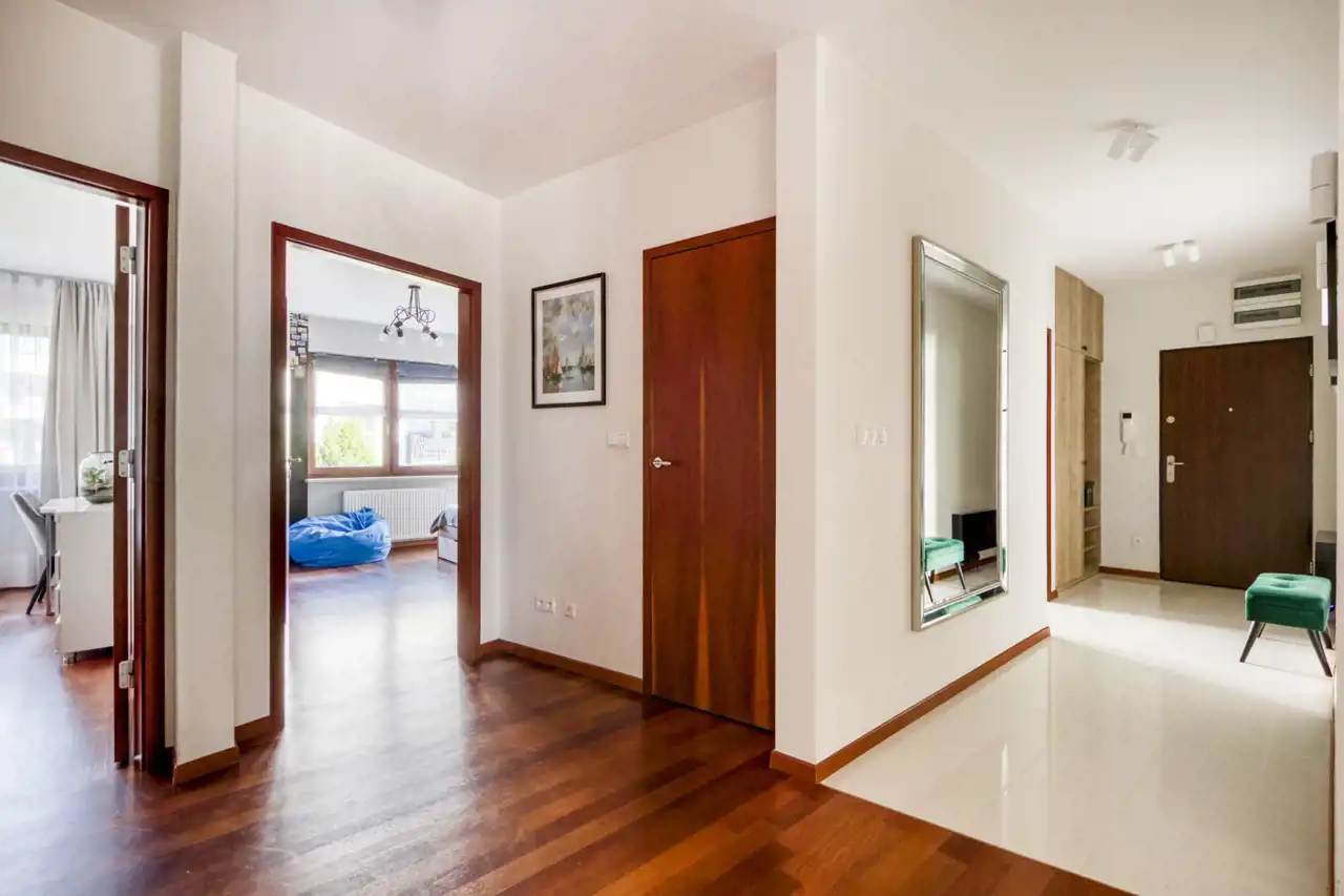 Przedstawiamy komfortowy 4-pokojowy apartament o powierzchni 123 m.kw., 10 minut spacerem od stacji metra i 2 min. do przystanku autobusowego. Mieszkanie znajduje się na pierwszym piętrze kameralnego (2 piętra) budynku z windą.