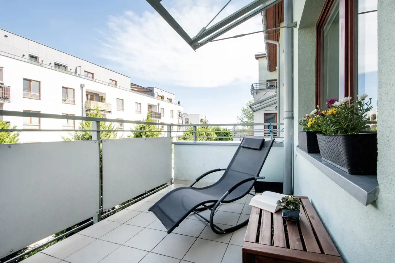 Okna drewniane, parapety marmurowe, podłoga parkiet z drewna egzotycznego (Merbau). Salon z kuchnią skierowane są na południowy zachód, sypialnie północny wschód. Do mieszkania przynależą 2 duże balkony.
