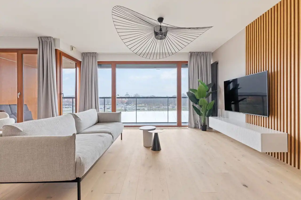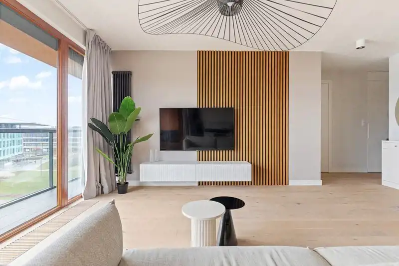 Apartament został zaprojektowany z dbałością o detale i wykończony z wysokiej jakości materiałów.