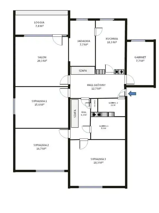 - Gabinet lub pokój gościnny (8 m²) zlokalizowany przy wejściu.