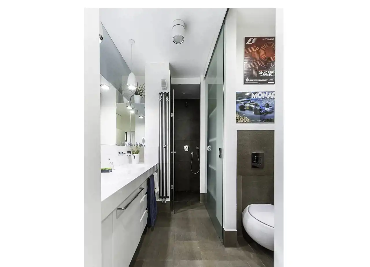 Wygodne i przestronne łazienki wykończone wysokiej klasy materiałami renomowanych marek, takich jak Villeroy & Boch, dodatkowo wyposażone w system nagłośnienia.