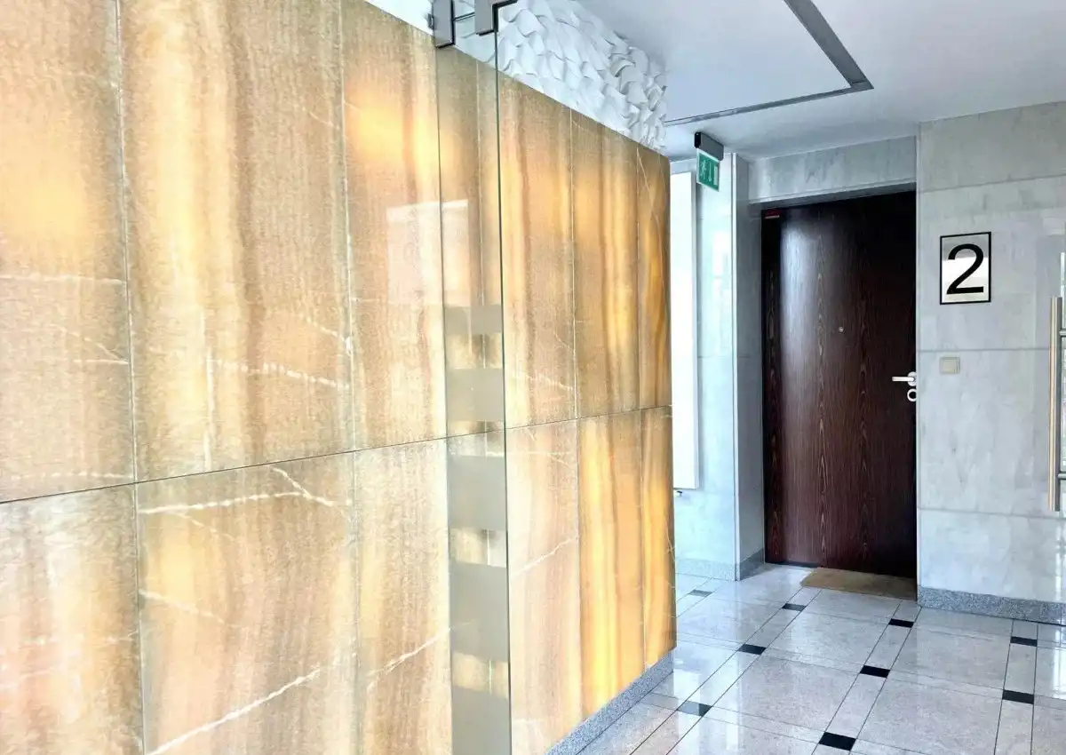 Wykończenie klatek schodowych i innych części wspólnych to połączenie kamienia, drewna i stali, co podkreśla elegancki charakter budynku.