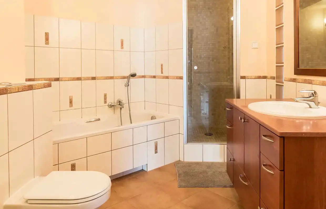 - główna sypialnia z klimatyzacją, prywatną garderobą, łazienką oraz balkonem z widokiem na patio