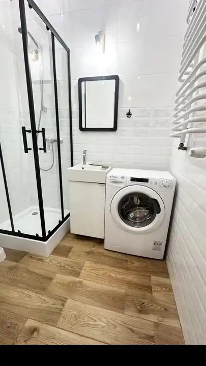 - łazienka z WC, kabiną prysznicową, umywalka, lustro, pralka.