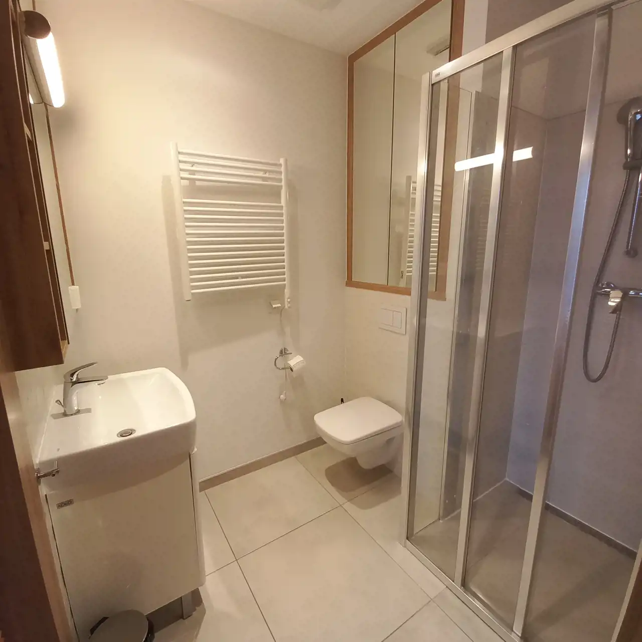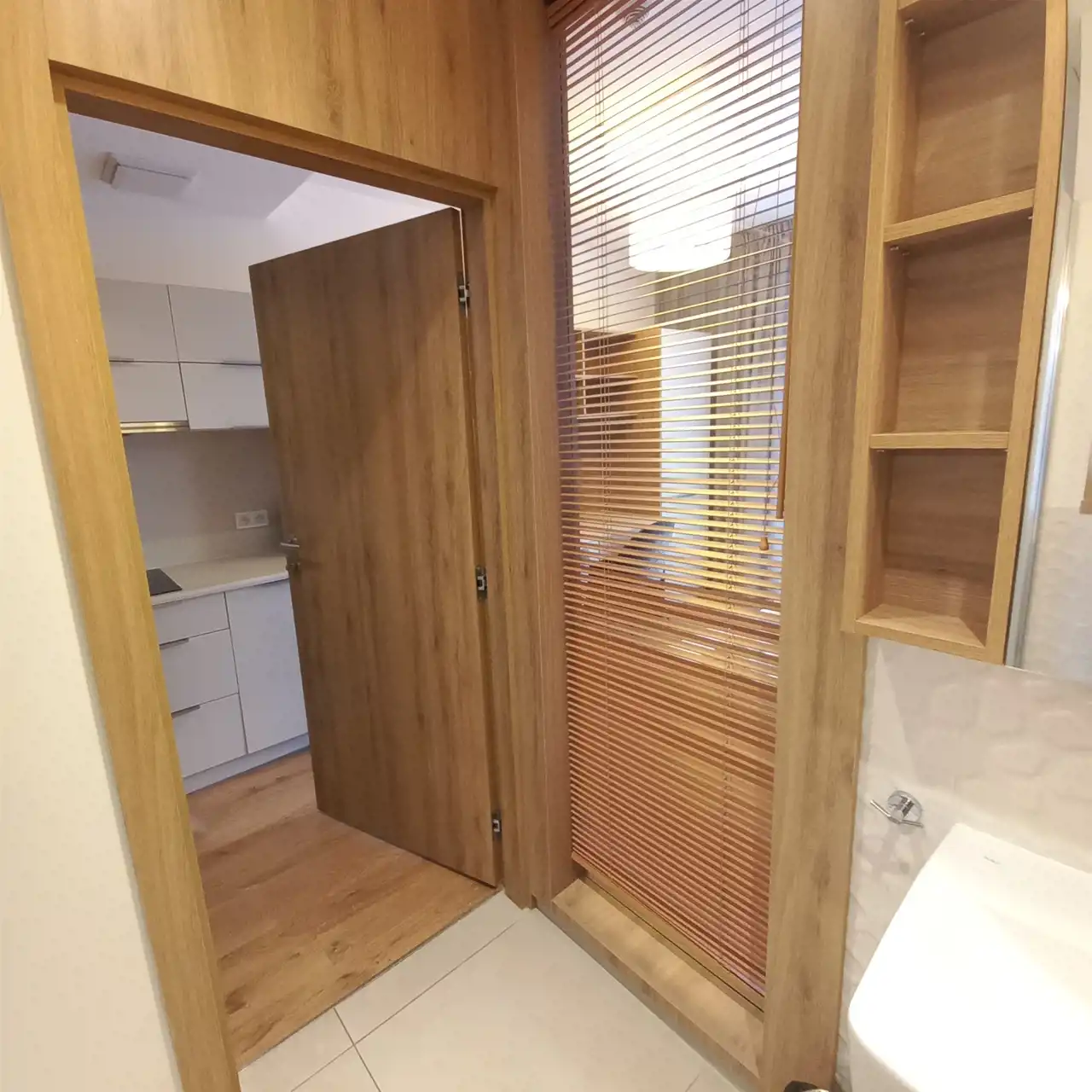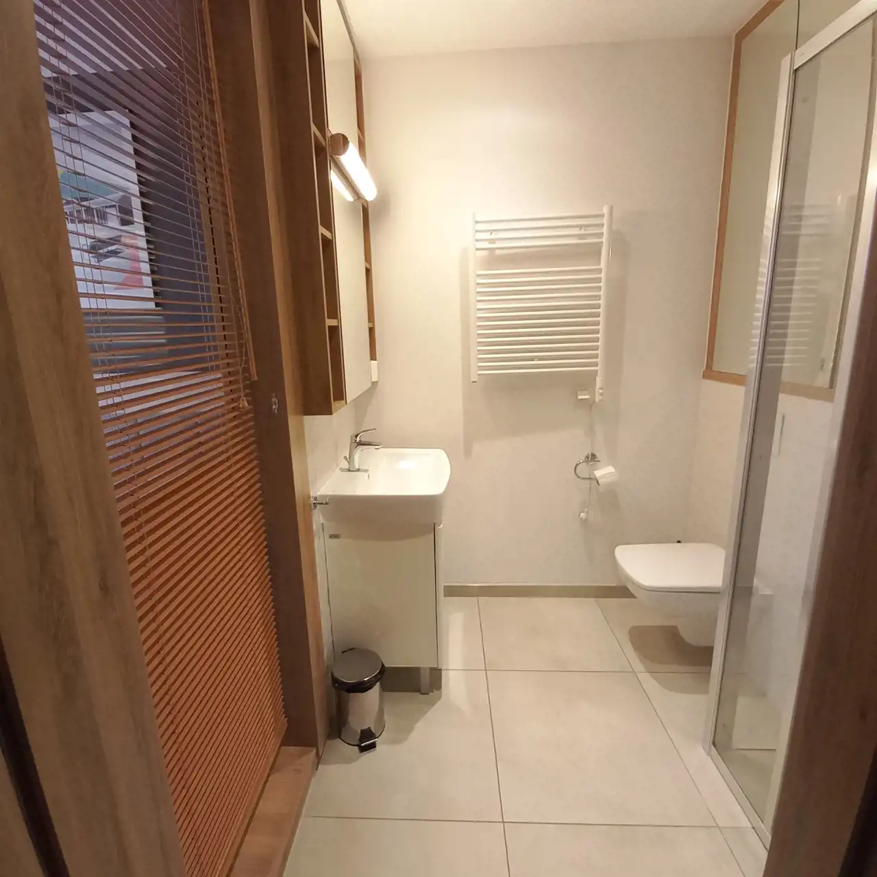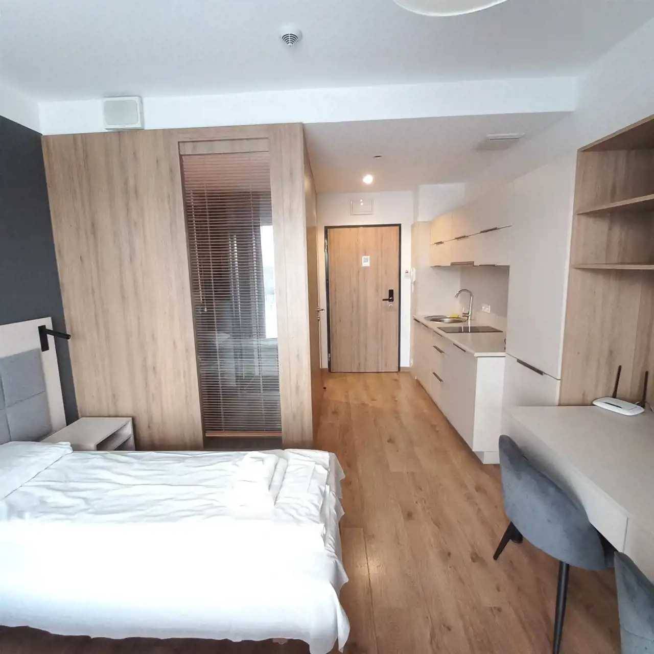 Składa się z pokoju z aneksem kuchennym, przedpokoju oraz łazienki z prysznicem i WC.