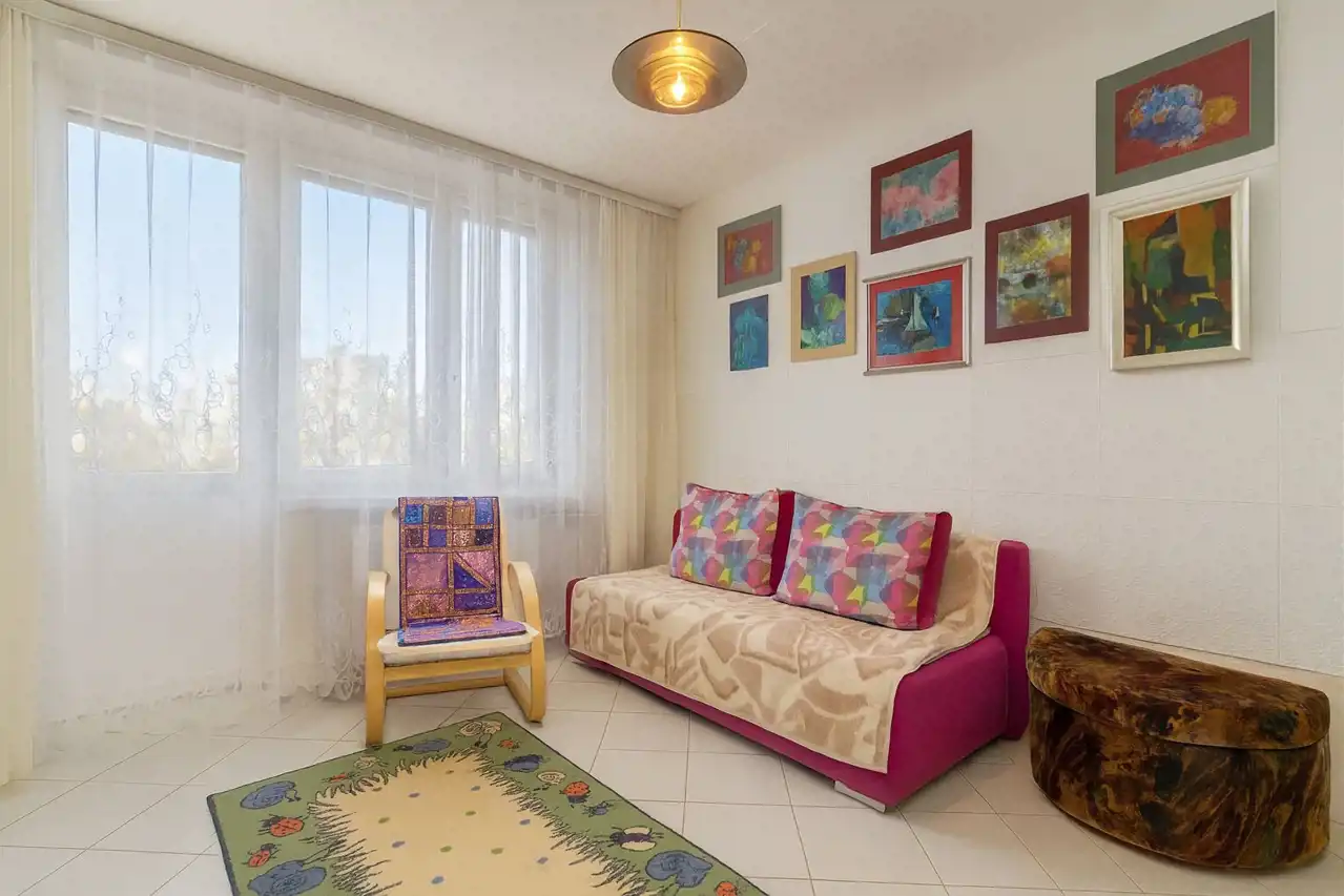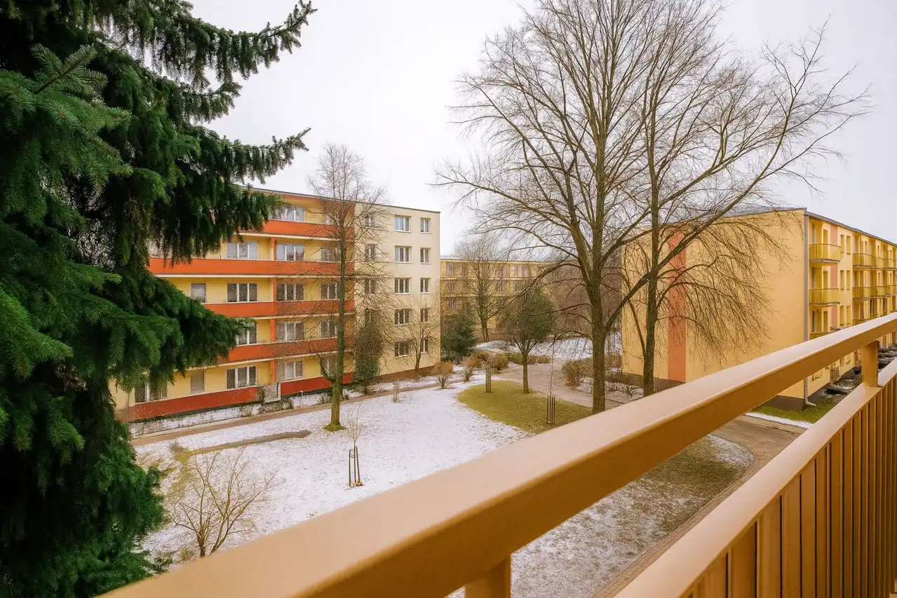 Duże okna pokoju i obszerny balkon, ponad 3m2, skierowane na południowy wschód, z widokiem na rozległy, zielony skwer osiedla.