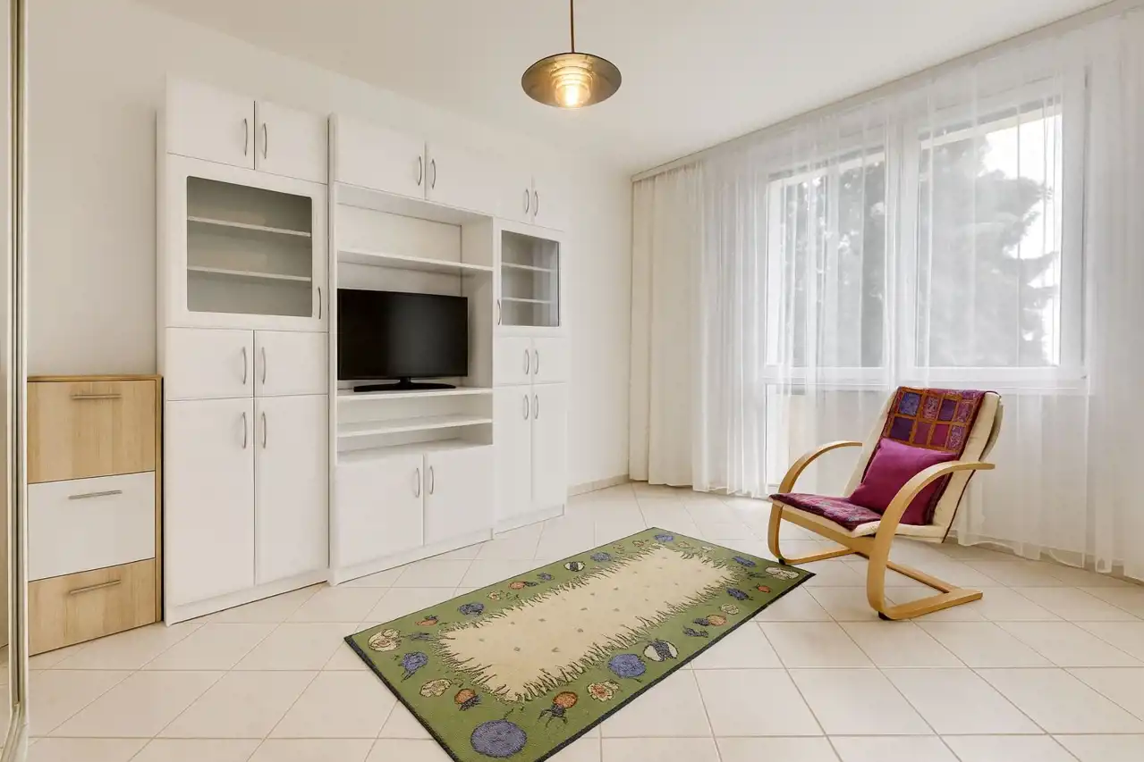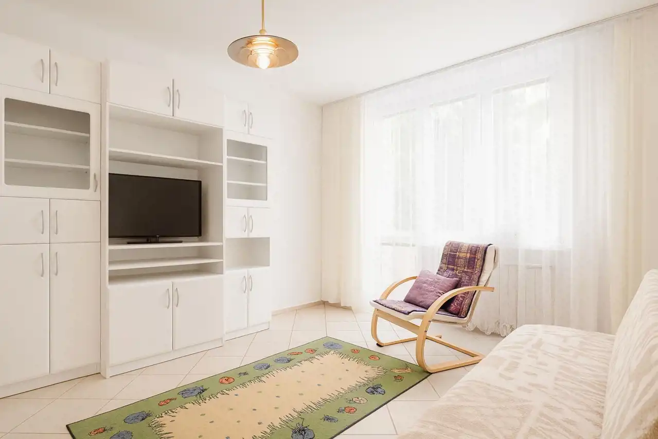 W cenie sprzedaży pozostają meble, w tym duża szafa garderobiana z przesuwanymi, lustrzanymi drzwiami, komplet szafek / meblościanka, kanapa, taboret, fotel.