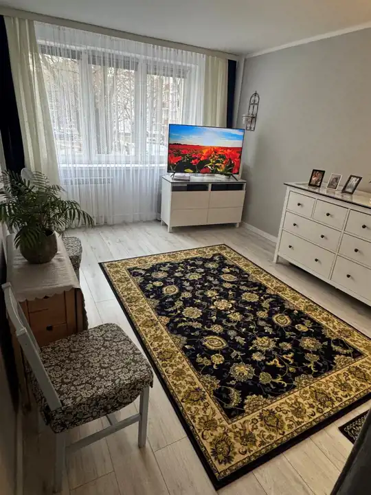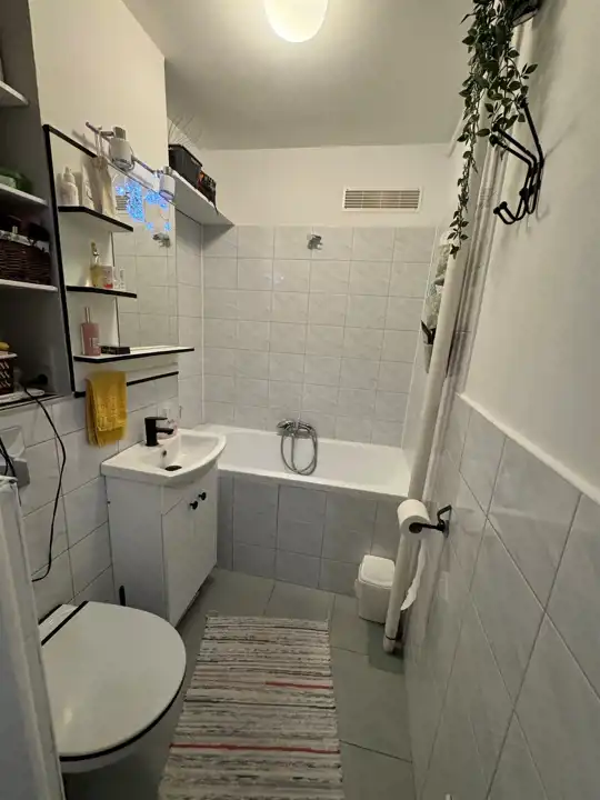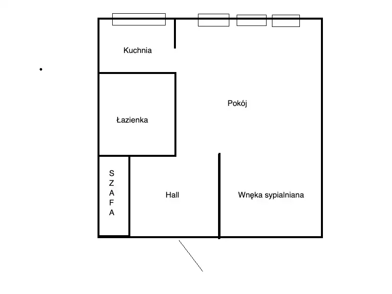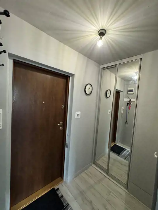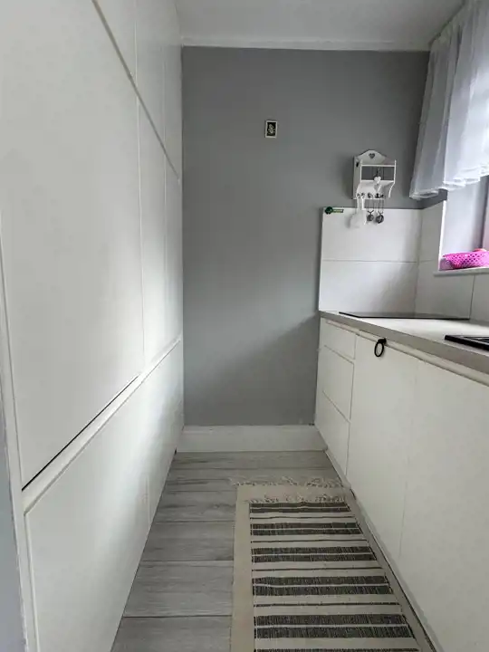 Układ mieszkania jest funkcjonalny. Po wejściu znajduje się kwadratowy hol z szafą wnękową po lewej stronie. Dalej mamy wejście do pokoju dziennego oraz ustawną łazienkę wyposażoną w wannę. Całość jest zadbana, praktyczna i gotowa do wygodnego użytkowania.