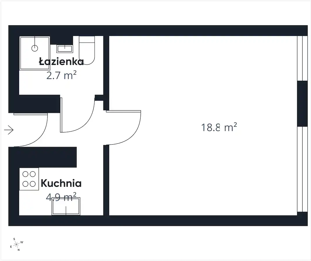 - jeden przestrzenny pokój + osobna kuchnia – świetny, funkcjonalny układ