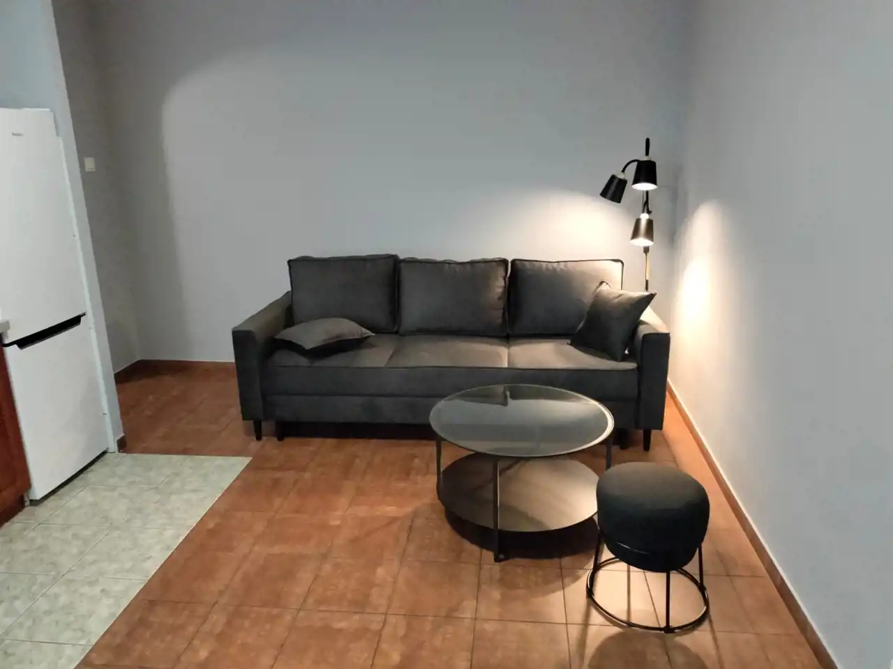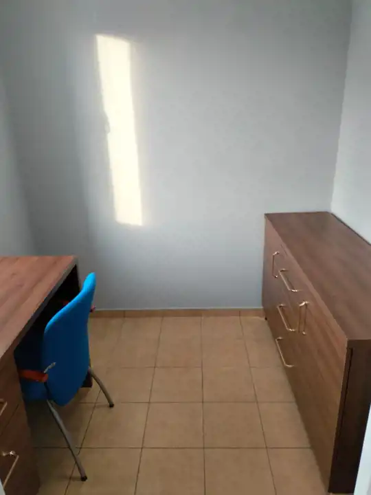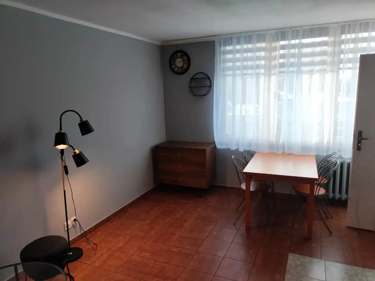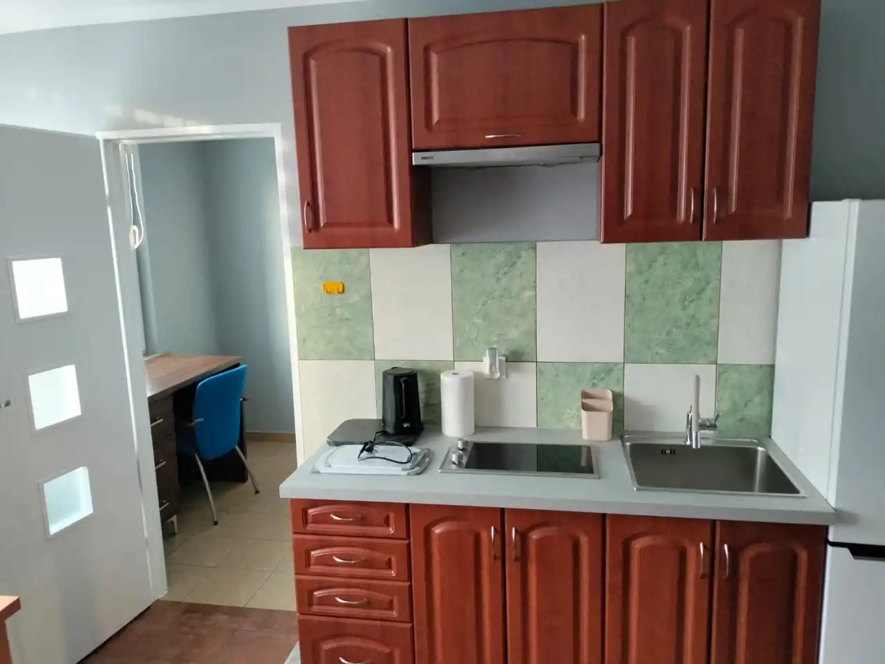 W dużym pokoju aneks kuchenny z lodówką i płytą ceramiczną, stół i 4 krzesła, komoda, stolik kawowy z pufą oraz duża wygodna sofa (nowa). W przedpokoju duża szafa. W małym pokoju miejsce do pracy: nowe biurko z krzesłem biurowym oraz nowa duża komoda
