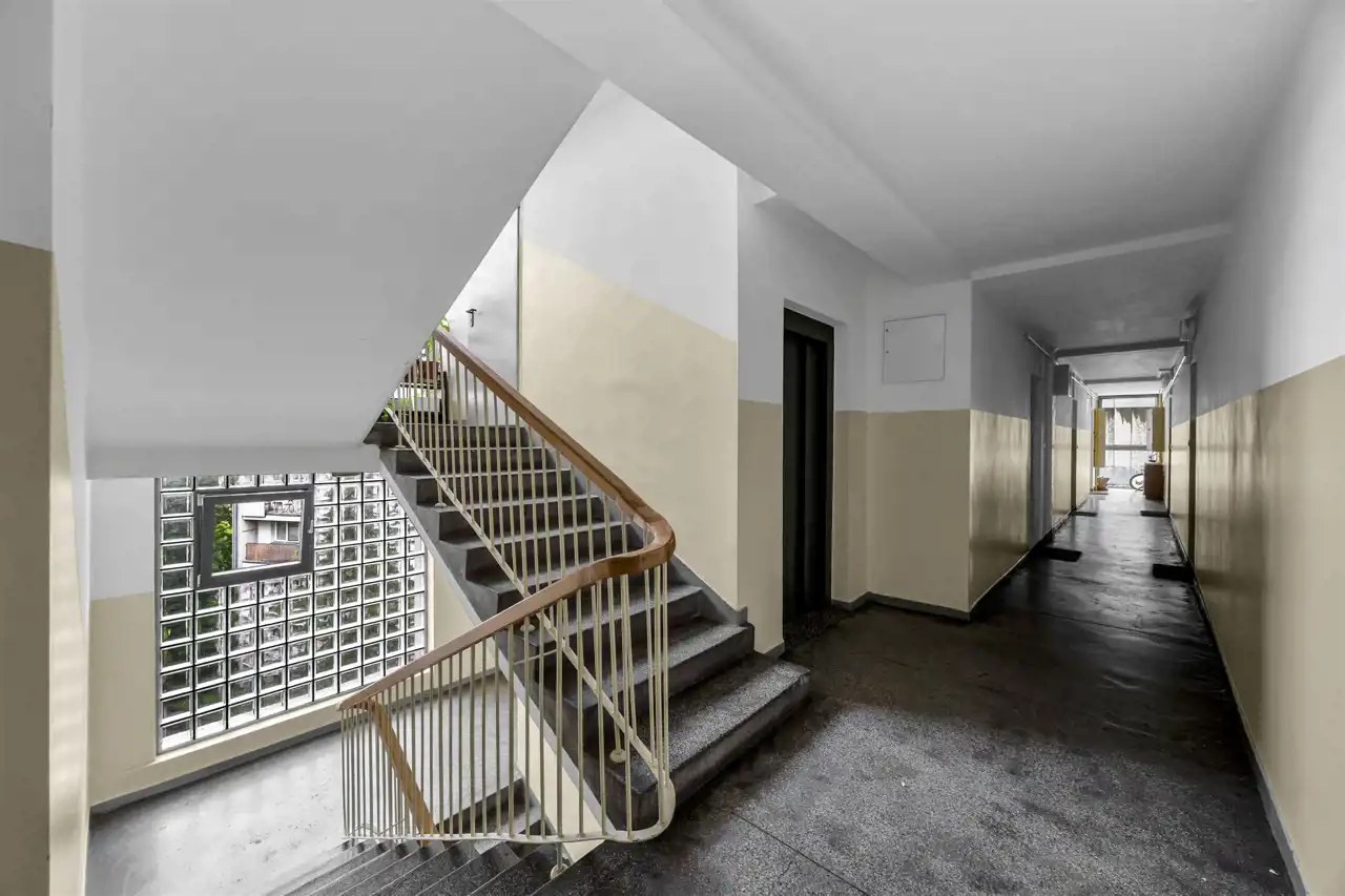 Budynek jest po generalnym remoncie (elewacja, instalacje), utrzymany w bardzo dobrym stanie technicznym. Winda dojeżdża do 5. piętra, a na poziom mieszkania prowadzi jedno dodatkowe piętro schodów.