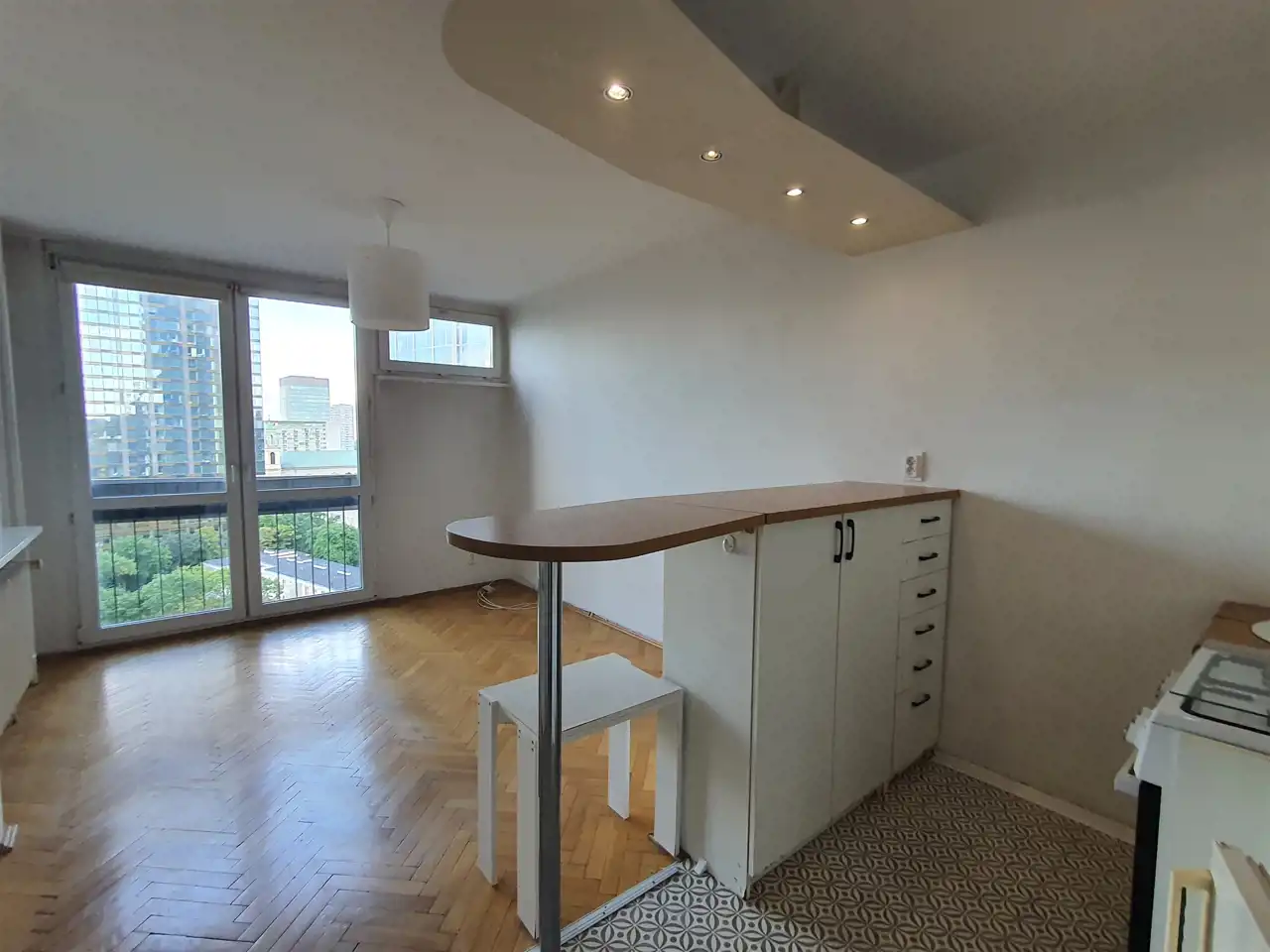 Pokój z rodzajem wysokiego baru oddzielającego aneks kuchenny i dalej otwarte przejście do części sypialnianej.